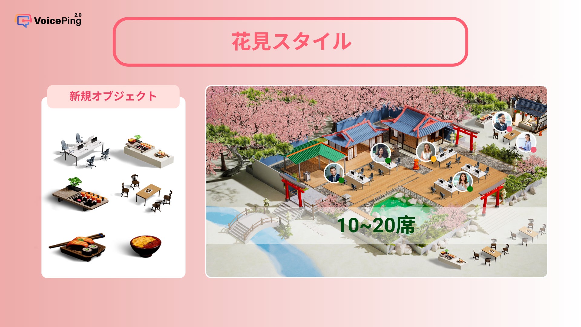 VoicePingは、新たに3種類のフロア背景画像を公開し、ユーザーに多様なエンタメ空間を提供しています。フロア設定の「フロアの背景画像」セクションから好みの画像を選択することで、花見、ビジネスカジュアル、ゲームという3つの異なるテーマを楽しめます。さらに、これらの画像をベースとしてカスタマイズできます。