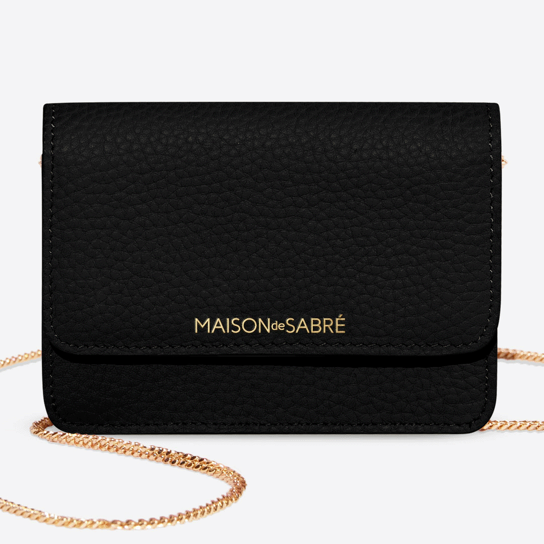 プレミアムグレインレザー使用 / コンパクトなマチ付き収納 / ゴールドチェーンのストラップ付き / マグネット開閉式 / 背面ポケットあり / 前面にゴールドロゴのハードウェアディテール / 最大4文字までイニシャル刻印可