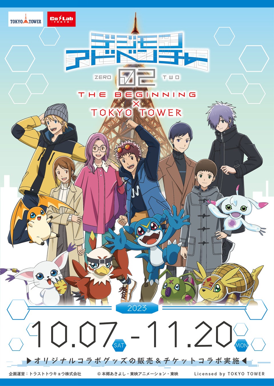 トラストトウキョウ株式会社(本社:東京都渋谷区)が運営する東京タワー内「Co・Lab-TOKYO-」にてデジモン最新映画『デジモンアドベンチャー02 THE BEGINNING 』と東京タワーのコラボイベント『デジモンアドベンチャー02 THE BEGINNING × TOKYO TOWER』を開催いたします。東京タワー内を巡るスタンプラリー、メインデッキ(展望台)での特別展示や「Co・Lab -TOKYO-」での限定コラボチケット&限定コラボグッズ販売されます。他、会場でしか聴けない本イベント限定の東京タワー館内放送も!