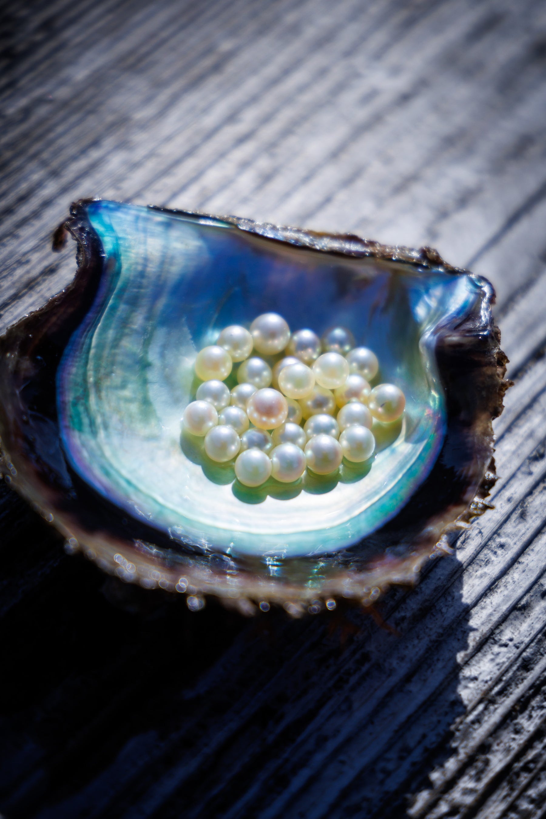 志摩市は、世界で初めて真珠養殖産業に成功した地です。真珠養殖の現場では、職人が使い勝手に合わせて角度や長さを微調整した「オリジナルの道具」が代々受け継がれており、その手から生み出される真珠の色味や輝きもまた、一粒ひとつぶ異なります。