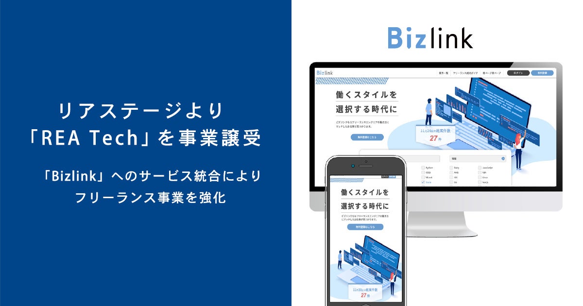 今回、リアステージ様から「REA tech(リアテック)」事業を譲受いたしました。サービスの立ち上げ段階からともにご一緒してきた関係だからこそ、短期間でスピーディーな条件調整の上でスムーズに契約締結に至ったものと考えます。弊社サービスである「Bizlink(ビズリンク)」事業も年々、右肩上がりで成長を進めています。仕事探しに悩まれているフリーランスの方々や人材不足に悩まれている顧客企業の皆様方により一層高い価値をご提供できるよう、今まで以上に弊社一同サービス向上に努めてまいります。
