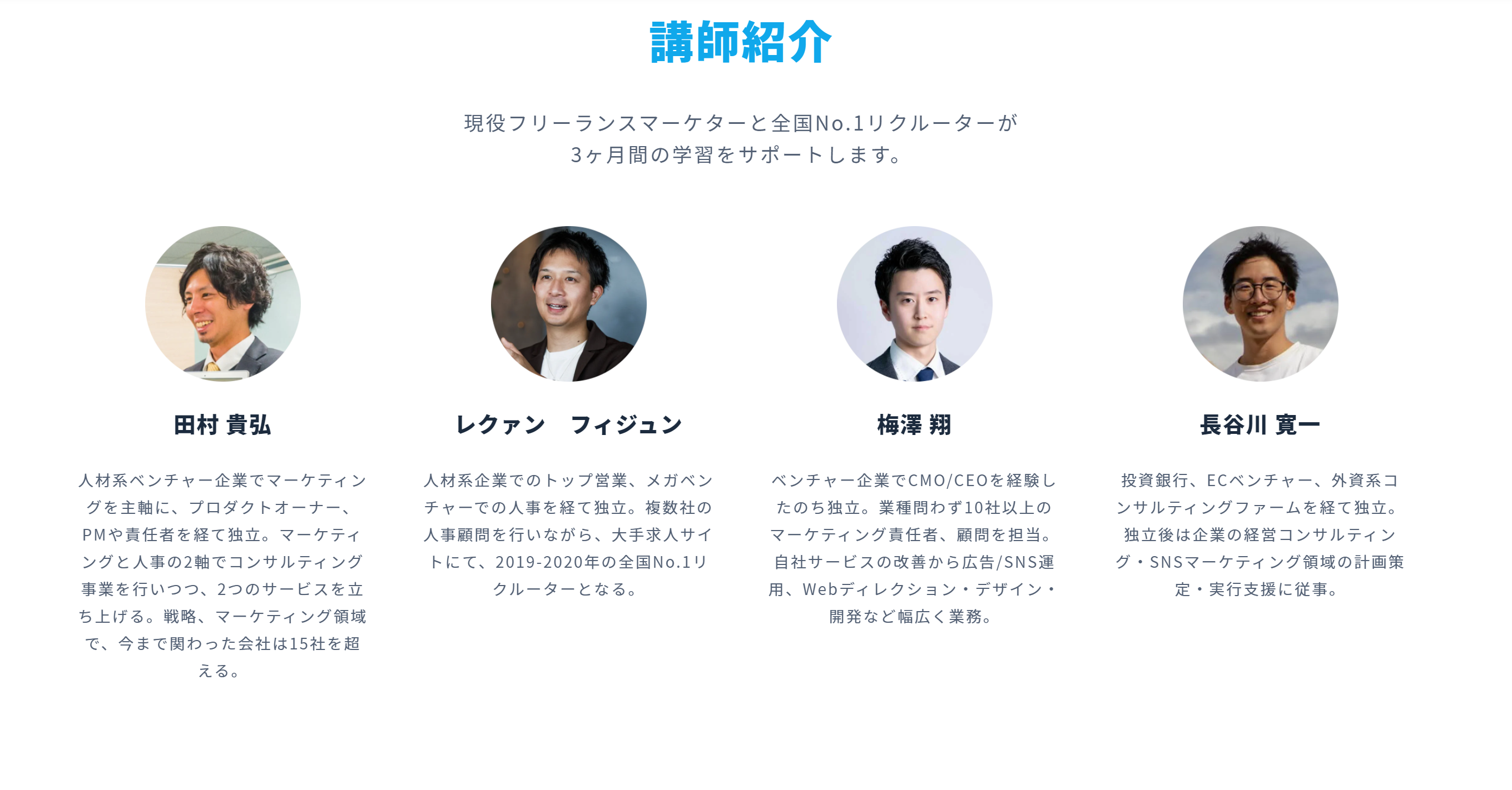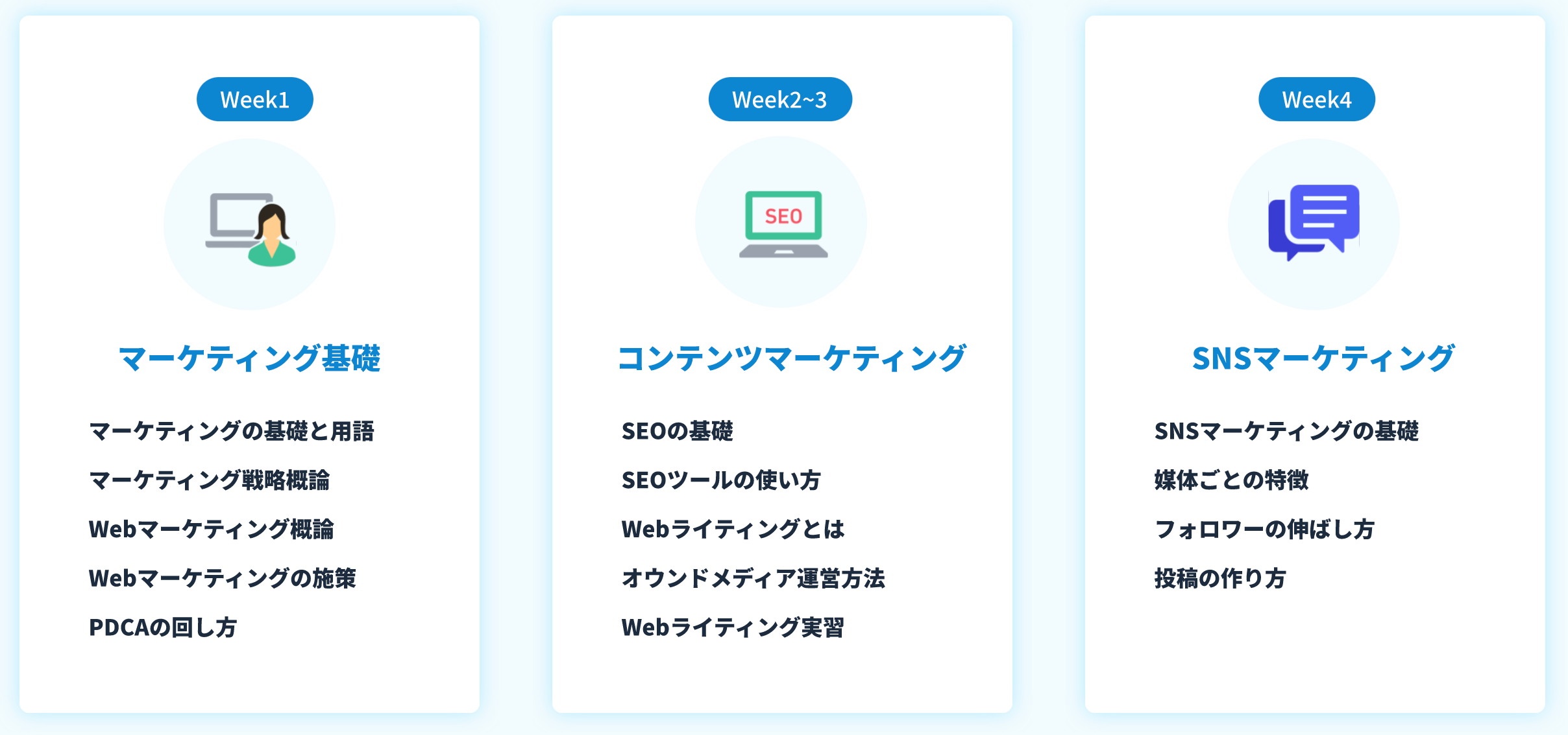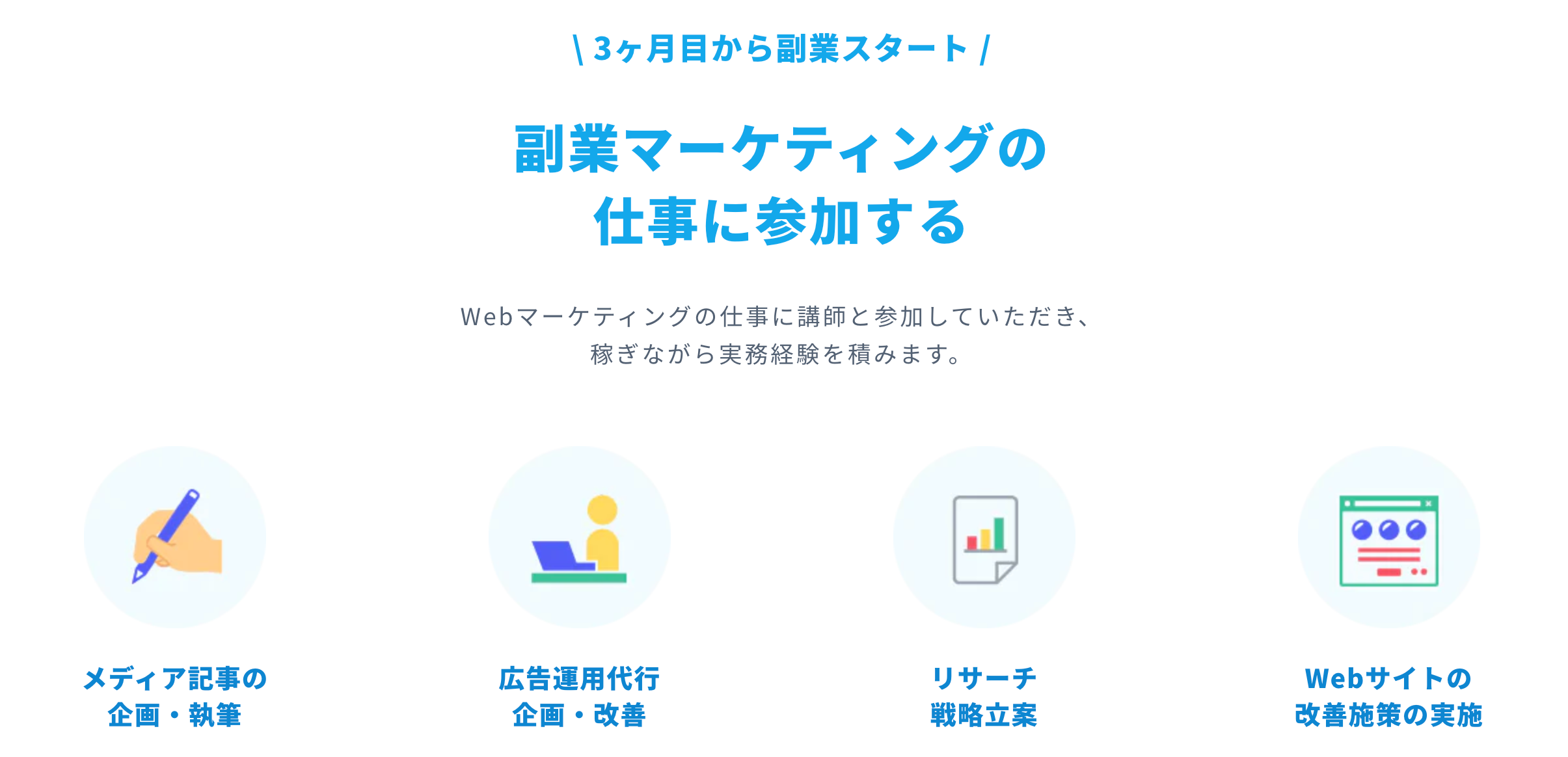 「Be Marketer(Webサイト:https://be-marketer.com)」は、3ヶ月間のカリキュラムで、未経験からWebマーケティング業務による副業で収入が得られるWebマーケターを育成するスクールです。2ヶ月間のオンライン学習でWebマーケティングを網羅的に学習した後に、1ヶ月間Webマーケティングの委託業務をリモートワークで行います。学習と委託業務の遂行を、マーケティングのスキルで独立・起業して活躍している講師が週に1回50分のオンライン面談を通してサポート。また、副業案件を獲得するための営業スキルを身につけるキャリアコンサルティングも同時並行で実施。3ヶ月間でスキルと実務経験、業務実績を得て卒業します。