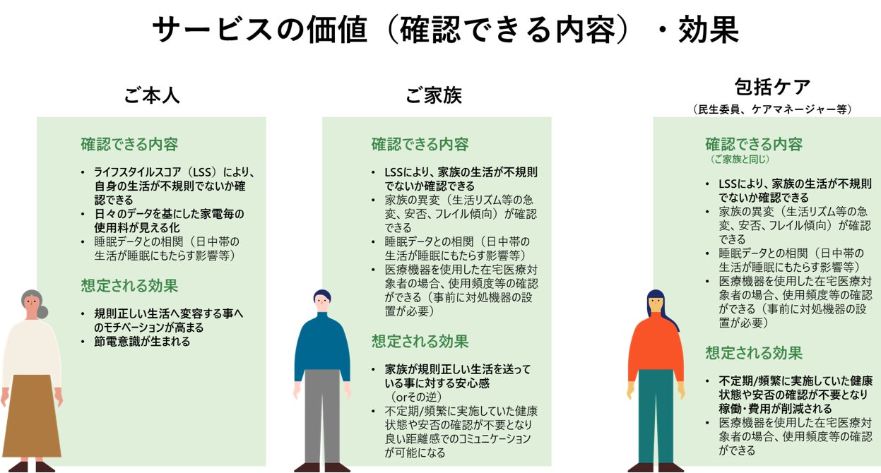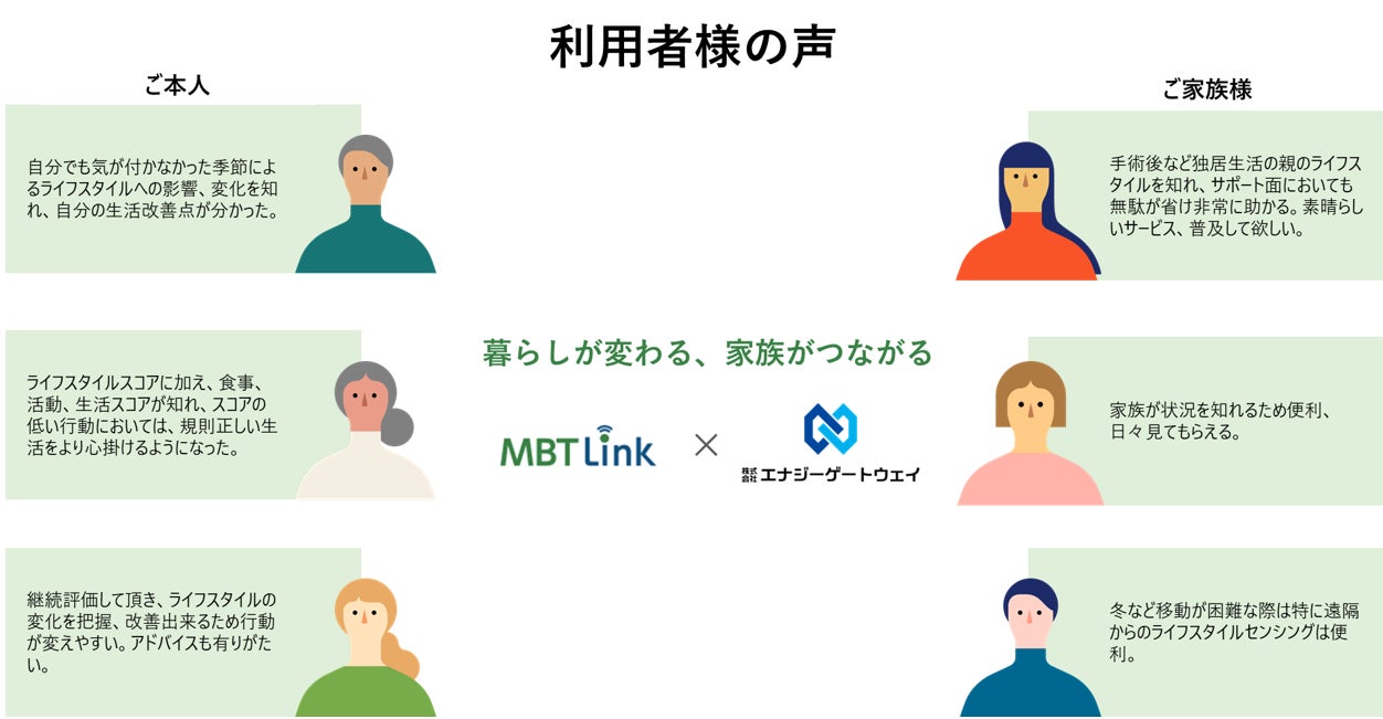 また、エナジーゲートウェイが提供する見守りアプリienowa(*1)との連携等も通じて、個々人の行動変容の促進、適時適切な介入等が可能になる環境を整備し、我が国の喫緊の課題である医療費・介護費等の増加抑制に貢献するサービスを目指します。