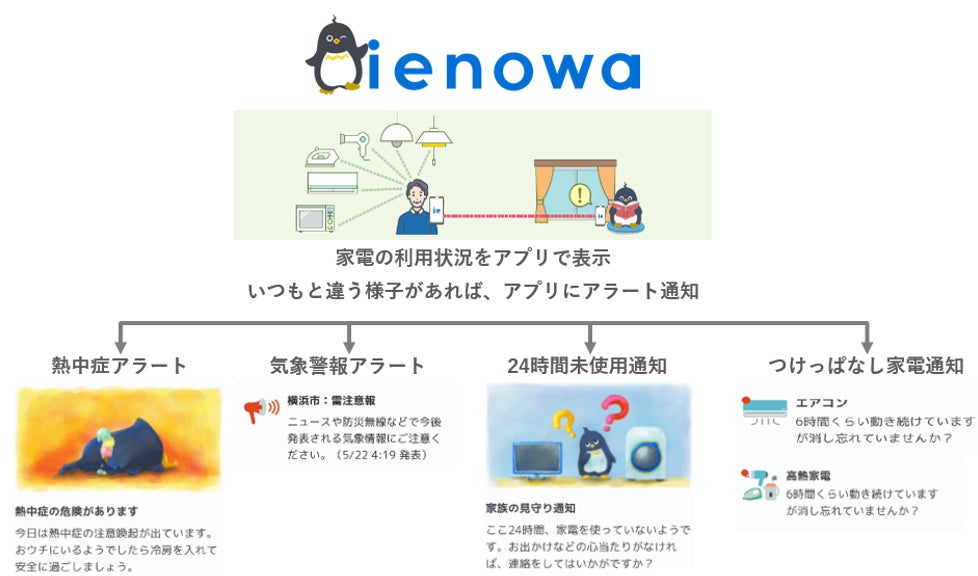 *1 エナジーゲートウェイが提供するアプリサービス。電力センサーを利用者さま宅分電盤に設置することで主要家電(*2)の使用電力量を推定するAI技術を用いて、主要家電の見える化に加え、日常的に使われていた家電が不使用になるなど、いつもと違う様子があればアラートを通知します。見守られる方が特別なことをしなくても、見守るご家族に生活の様子を伝えることができます。