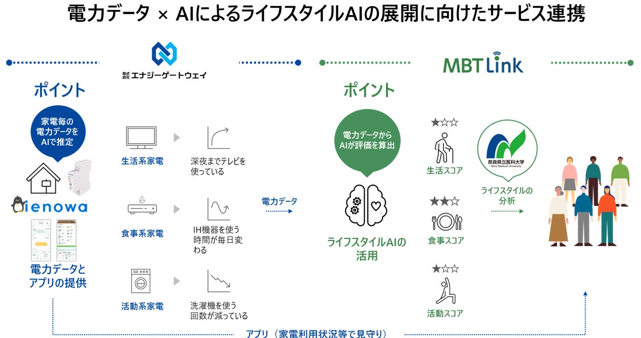 東京電力グループの株式会社エナジーゲートウェイ(本社:東京都港区、代表取締役社長:酒井 正充、以下「エナジーゲートウェイ」)と、奈良県立医科大学発スタートアップ企業、MBTリンク株式会社(奈良県橿原市、代表取締役社長:梅田智広、以下「MBTリンク」)は、電力データとAI等を活用したライフスタイルAIの普及展開に向け、サービス連携することをお知らせいたします。