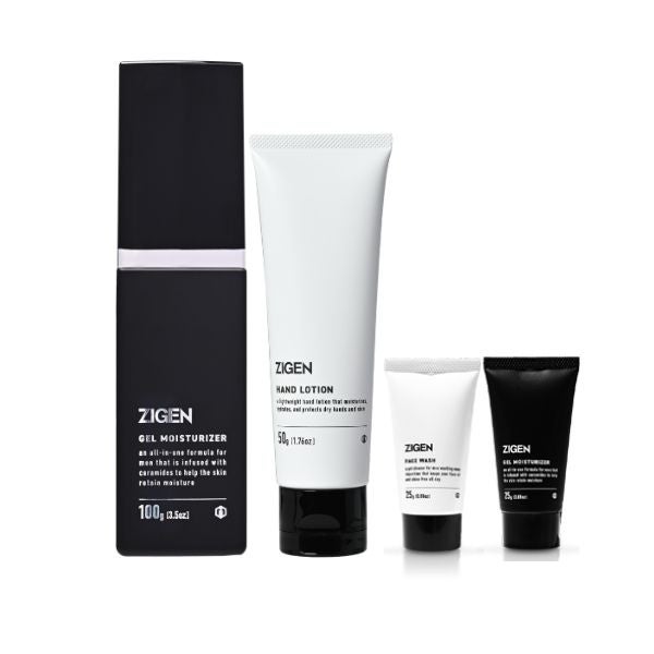 乾燥しがちな手と顔を同時にケアできる。Aセットでご紹介したハンドクリームに加え、化粧水・美容液・乳液・クリームを1本に凝縮したオールインワンタイプの保湿ジェルがセットに。オールインワンフェイスジェルは12月初旬にさらに使いやすく、スタイリッシュな容器に進化します。圧倒的な保湿力と持続力を兼ね備え、長年の間ZIGENのNo.1商品。敏感肌の方も使えるよう徹底した7つの低刺激処方もこだわりの一つ。どちらもアイテムも保湿の王様「ヒト型セラミド」配合で、保湿力は抜群。