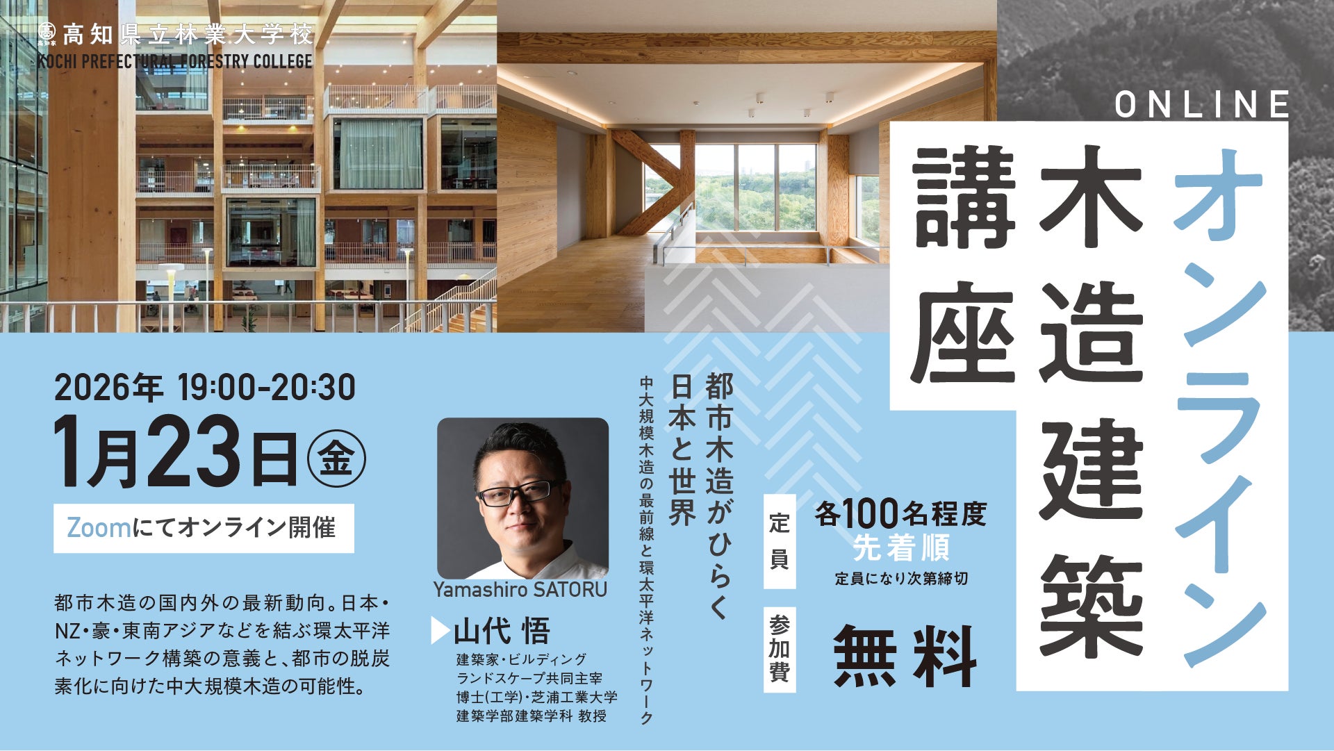 建築家・隈研吾氏が校長を務める高知県立林業大学校(高知県香美市)は、木造建築について学ぶオンライン講座(主催:高知県立林業大学校、後援:公益社団法人 日本建築士会連合会/一般社団法人 高知県木材協会)を開催いたします。各回異なるテーマ・講師による、全3回の公開講義です。本リリースでは、第3回目の講義についてお知らせいたします。建築実務者だけでなく、建築を学ぶ学生や森林・林業関係者など、木造建築に関心をお持ちのみなさまのご参加をお待ちしております。中大規模建築物の木造化が確実に広がりつつある中で、これからの木造建築への理解を深める本講座を是非ご活用ください。