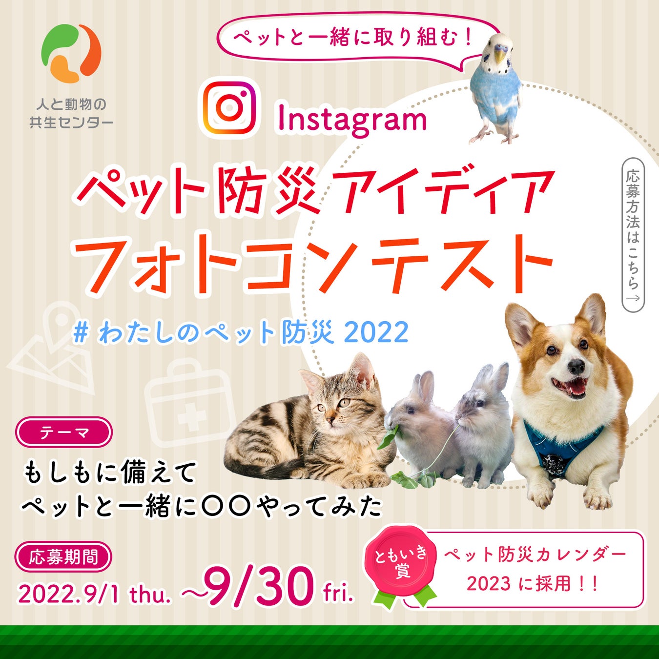 そこで同団体では、防災の日と動物愛護週間が制定されている9月を絶好の機会と捉え、「Instagramペット防災アイディアフォトコンテスト」を企画しました。