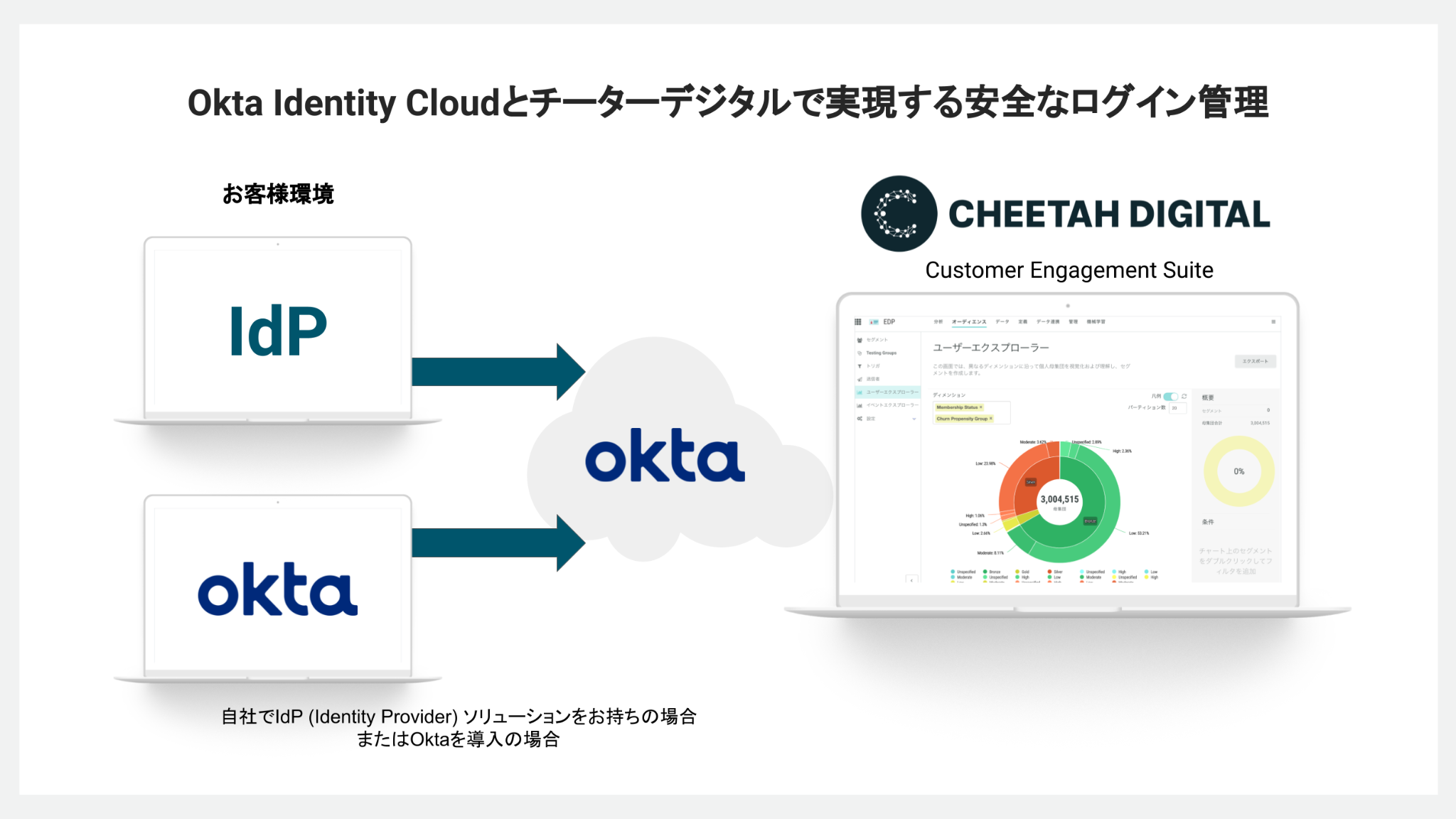 現代のマーケティング担当者向けに、次世代の顧客エンゲージメントソリューションを提供するチーターデジタル株式会社(本社:東京都港区、日本法人代表: 白井 崇顕、以下 チーターデジタル)は本日、Okta Japan株式会社(本社: 東京都渋谷区、代表取締役社長: 渡邉 崇、以下 Okta)が提供するアイデンティティ管理・認証基盤プラットフォーム「Okta Identity Cloud (https://www.ashisuto.co.jp/okta/ )」を活用することで、クラウドネイティブなマーケティング統合型プラットフォーム「Customer Engagement Suite (https://www.cheetahdigital.com/jp/solutions )」をより利便性が高く、安全性を担保して提供することを発表しました。