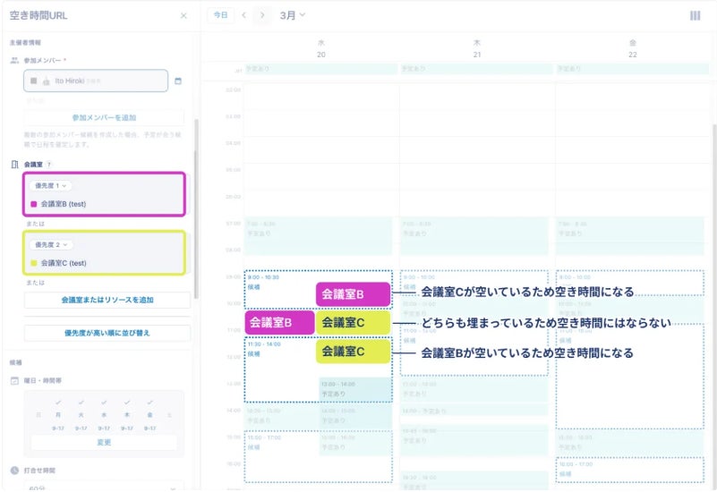 空き時間URLに複数の会議室を設定した場合には、いずれかの会議室に空きがある日時に候補を出すことができます。