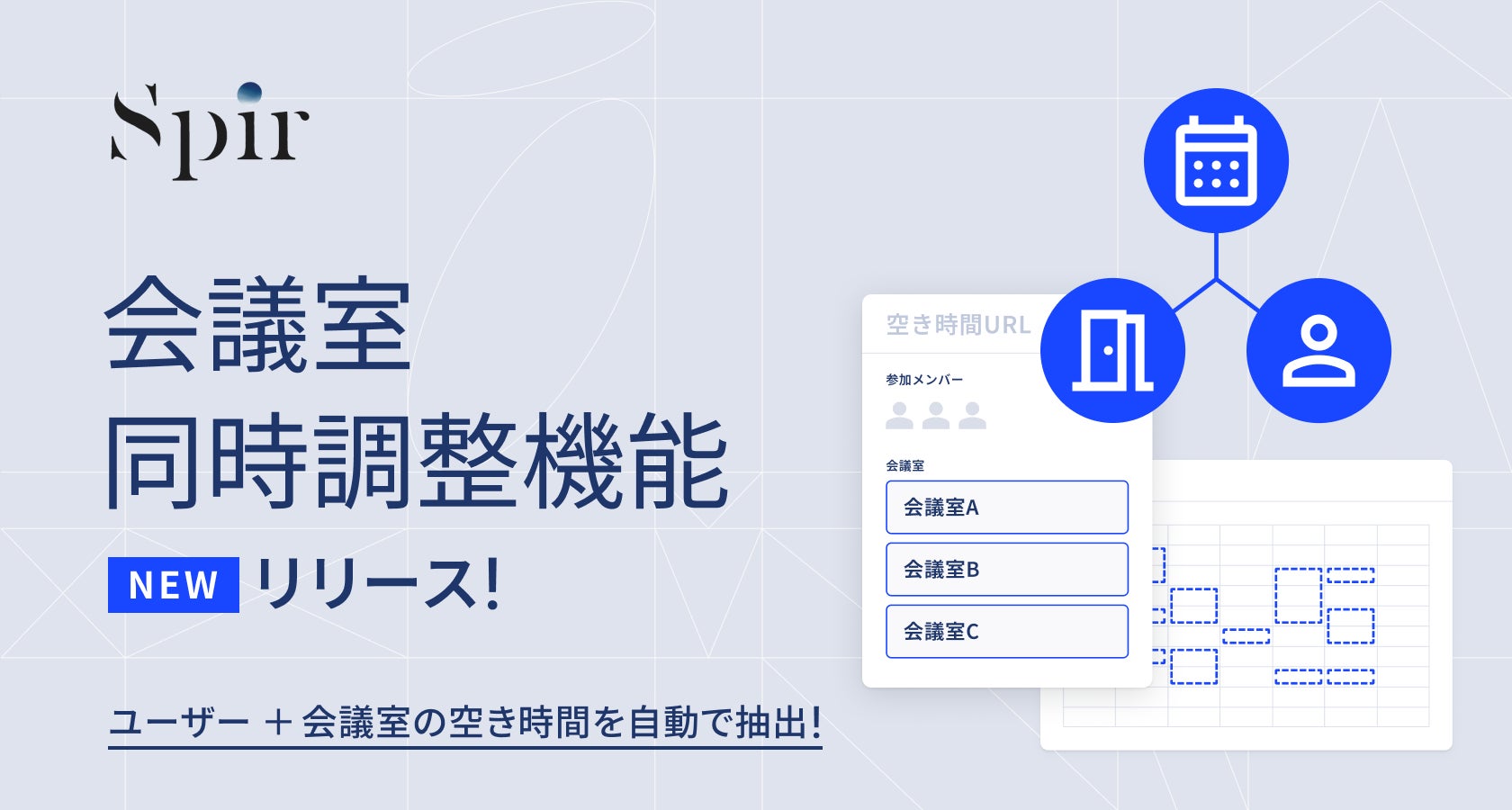 日程調整ツールの「Spir(スピア)」を展開する株式会社Spir(東京都中央区、代表取締役:大山晋輔、以下当社)は、会議室の同時調整機能を提供開始したことをお知らせ致します。