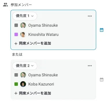 参加者のAnd/Or条件が指定できるため、「メンバーのうち誰か1人が参加する」「Aさんは必ず参加し、BさんとCさんのどちらか1人が同席する」などの柔軟な参加調整が可能です。