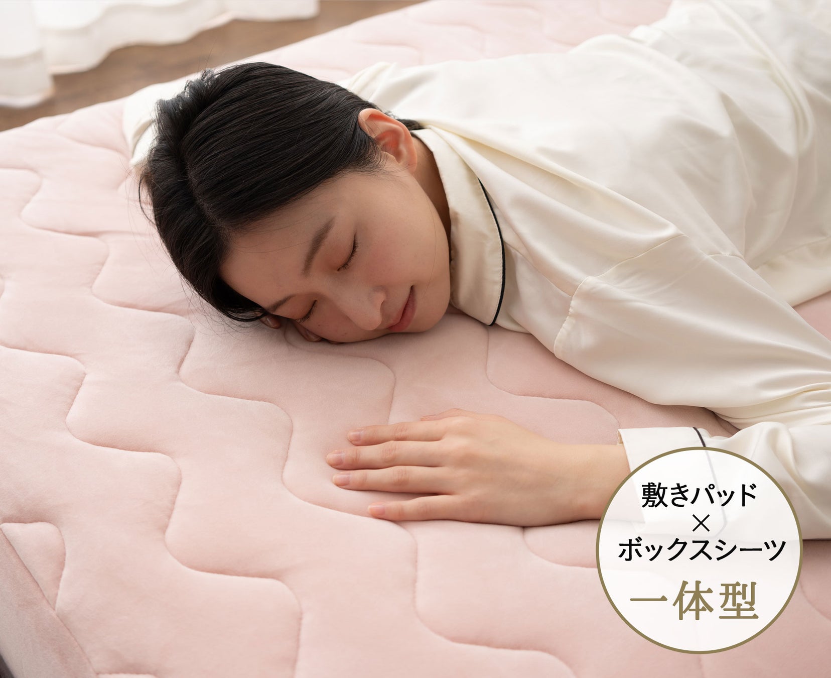 敷きパッドとシーツが一体型になったキルトボックスシーツ。敷き布団やマットレスをすっぽり包んでフィットします。