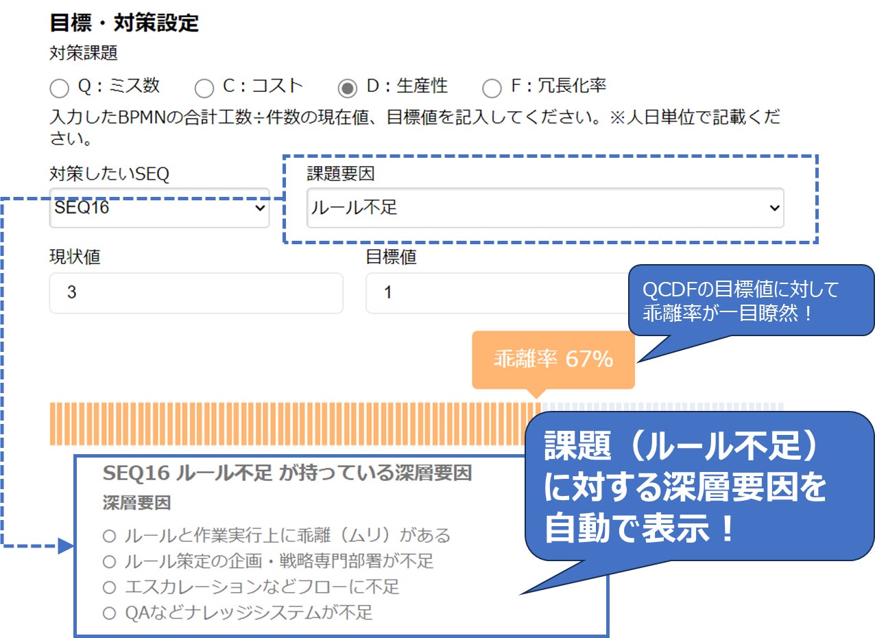 QCDF(品質・利益・生産性・体制)それぞれの目標値に対して、課題はなぜ発生してしまうのか、複数の深層要因を自動で可視化します。