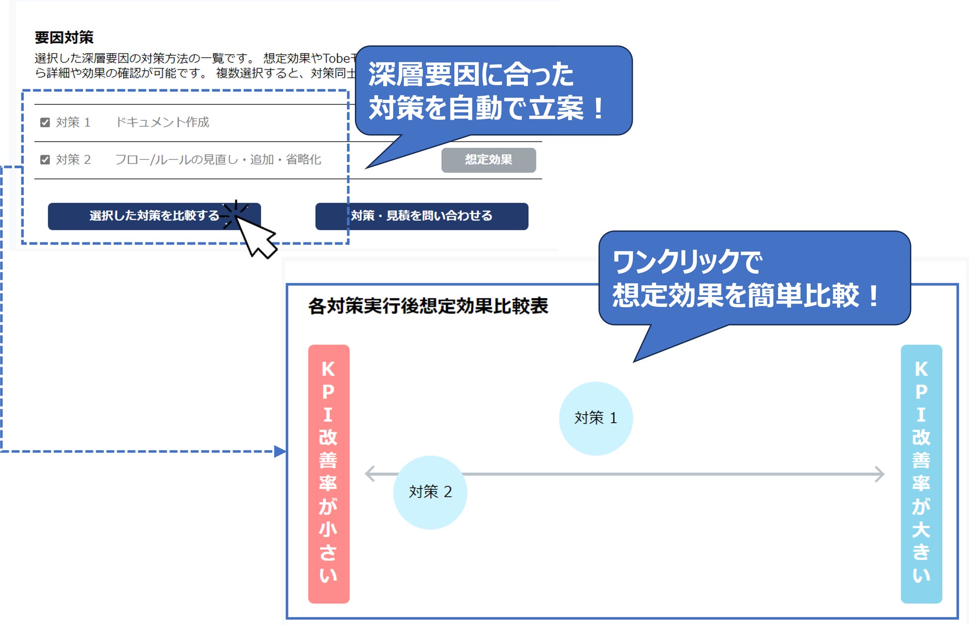これまでの統計データから、深層要因に最適な対策をBPL+が立案します。複数対策がある場合は、対策の優先度も自動でアウトプットされるため、対策の比較検討も容易に行えます。