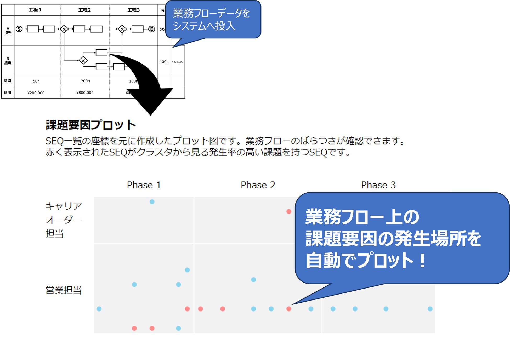 BPMN(業務フロー)データをシステムに投入すると、業務フローデータを座標化し作業の散布図を作成。フローパターンをクラスタリングすることで、課題要因となる傾向が高い作業箇所を赤く表示します。