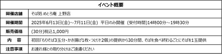 東京メトロ駅構内店舗および商業施設の企画・開発・運営管理、リテール事業を行う、株式会社メトロプロパティーズ(本社:東京都台東区、代表取締役社長:黒須良行)が運営する直営ブランド「そば処 めとろ庵 上野店」では、6月13日(金)から7月11日(金)まで(受付時間 14時00分~19時30分)平日限定で、30分間「そば食べ放題」を開催いたします。めとろ庵自慢の「もりそば3玉分」「かき揚げ1枚」「つけ汁2個」を提供。そばを食べ終わるごとに、そばを1玉ずつ提供させていただきます。おいしいそばを満腹になるまでご堪能ください!!