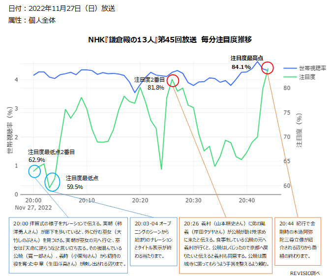 11月27日に放送された第45回「八幡宮の階段」は、視聴者にどのように見られていたのでしょうか? テレビの視聴者の様子を、1分毎の「REVISIO推定視聴率」と、「テレビの前にいる人のうち、テレビ画面に視線を向けていた人の割合=注目度※」のグラフで見てみました。