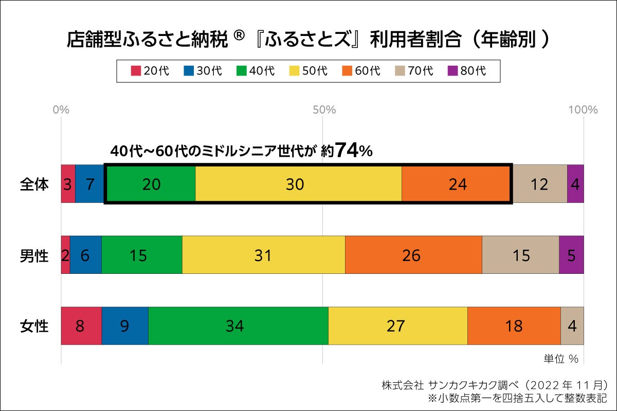 対して、店舗型ふるさと納税(R)の年代別利用者の割合は50代が最も高く、また、70代〜80代以上の方にもご利用いただいています。