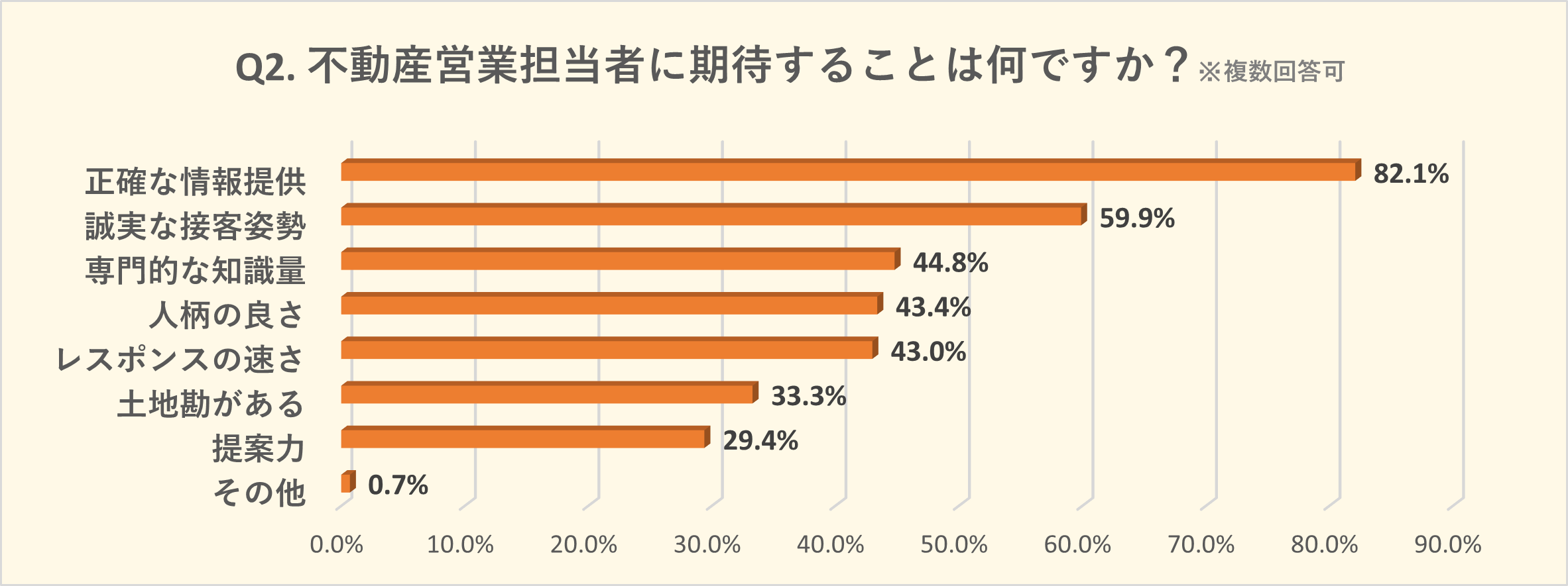 2) 不動産営業担当に期待することの1位は「正確な情報提供」82.1%で圧倒的な得票数。消費者目線では正しい情報を仕入れたいとの考えがあり、“正直な不動産営業のスタイル”が求められている。