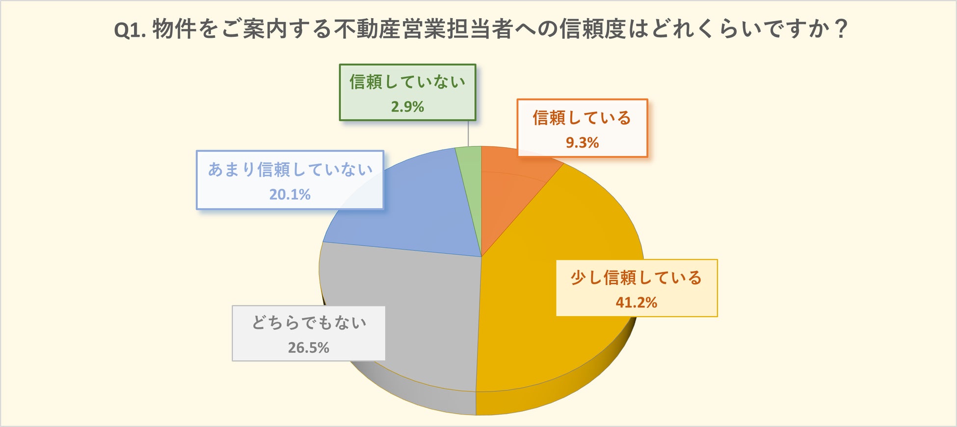1) 不動産営業担当への信頼度は「信頼している」9.3%「少し信頼している」41.2%で、合計するとおよそ5割が一定以上の信頼感を抱いている。「あまり信頼していない」20.1%「信頼していない」2.9%と、不信感を持つ方も2割程度見受けられた。