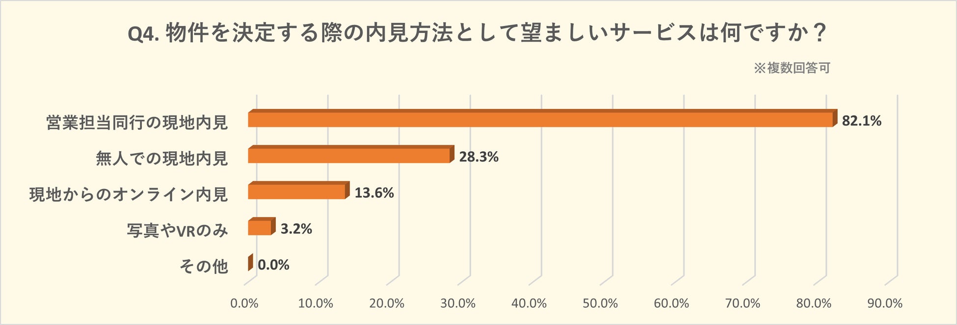 およそ8割という圧倒的な得票となったのは「営業担当同行の現地内見」となっており、内見の方法が多様化する現在でもいまだに営業担当者案内による現地内見を望む方が多い結果となりました。
