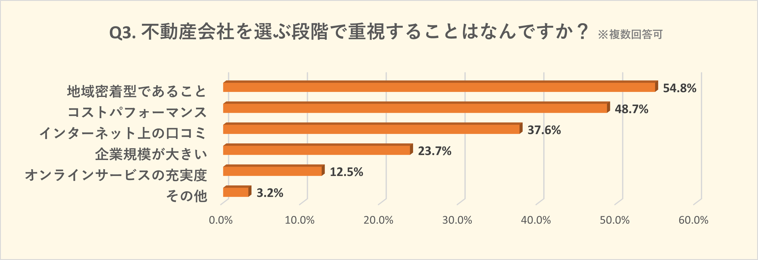 一番多かった回答は半数以上の方が選んだ「地域密着型であること」54.8%となっており、規模の大きさよりもその地域に根付いた会社を選ぶ傾向がみられました。