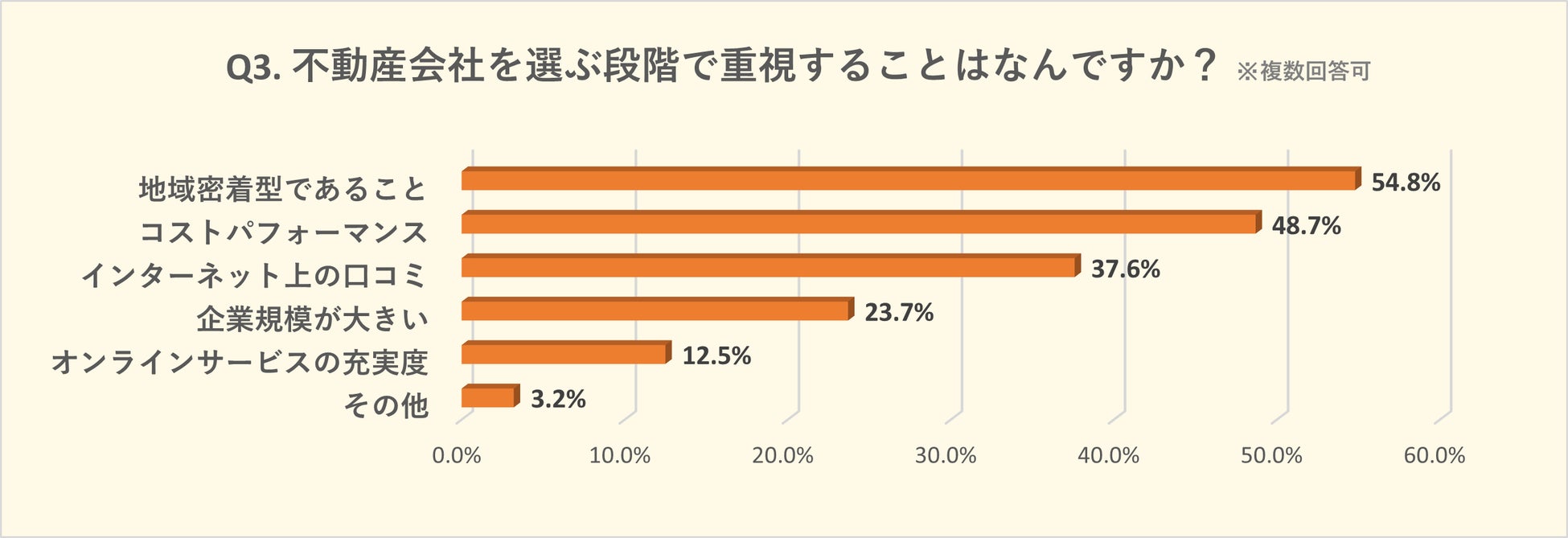 続いては、営業担当者へ出会う前の住まい探し初期段階で悩むポイント「不動産会社を選ぶ段階で重視すること」についての設問です。