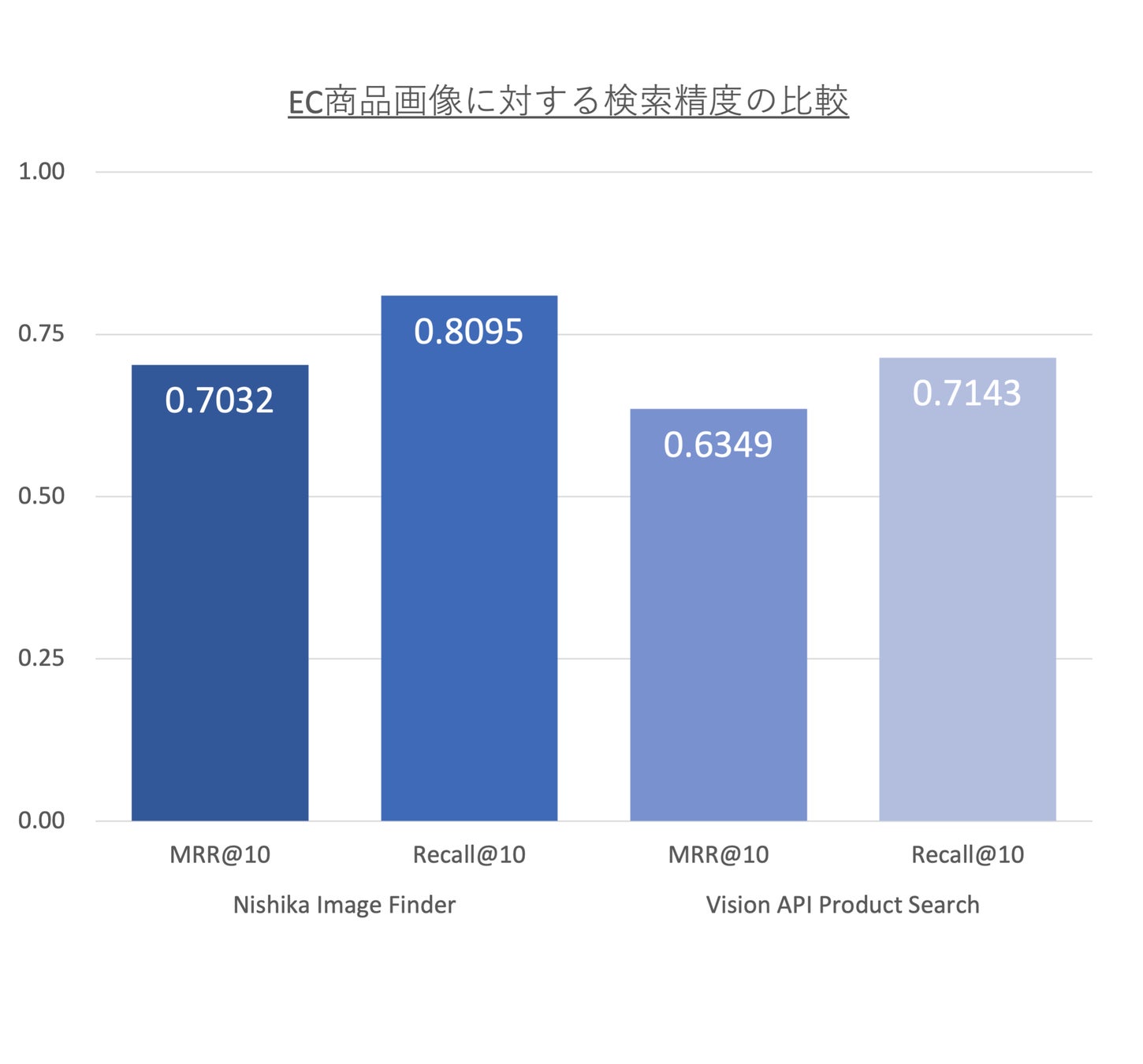 数十件のデータ分析コンペを開催してきた国内最大級のデータ分析コンペ事業者であるNishikaは、多くのコンペ経験から「実際に精度が出せる」AIの開発方法に関する知見を蓄積してきており、その一環として開発したNishika Image Finderは、約50万件の商品をお持ちのあるEC事業者様のデータを活用した検証にて、MRR (Mean Reciprocal Rank), Recallのいずれの指標でも、Vision API Product Searchの水準を10ポイント近く上回りました。