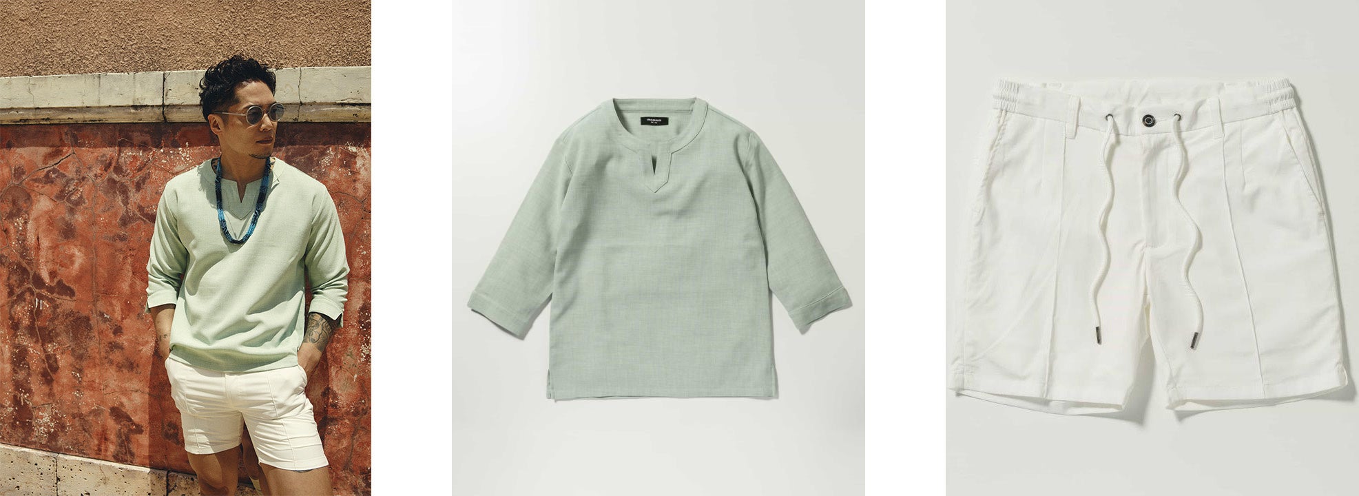 ・キーネックシャツ ¥14,960(税込) ・ハーフスラックス ¥16,940(税込)