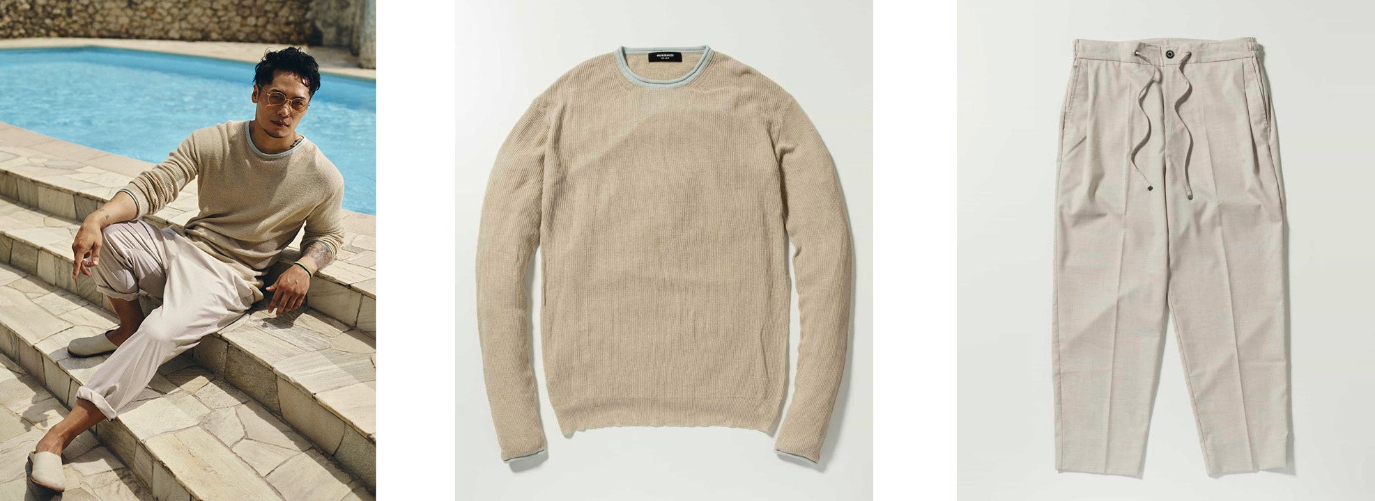 ・コットンリネンクルーネックニット ¥15,950(税込) ・リラクシングタックパンツ ¥18,920(税込)