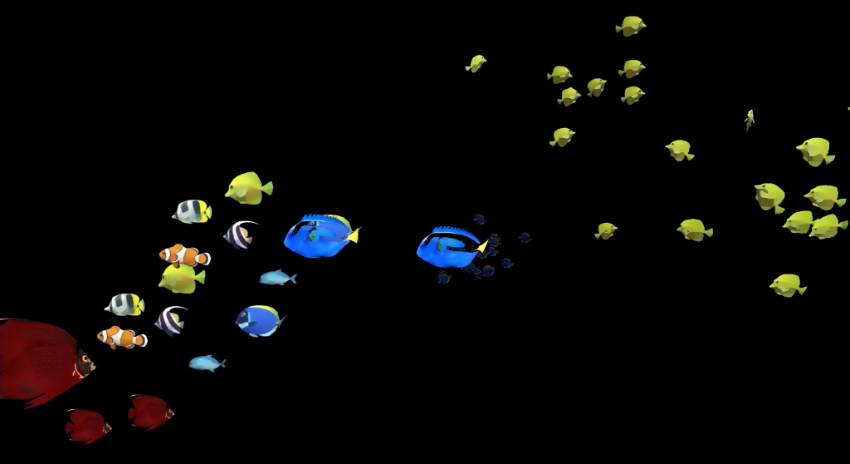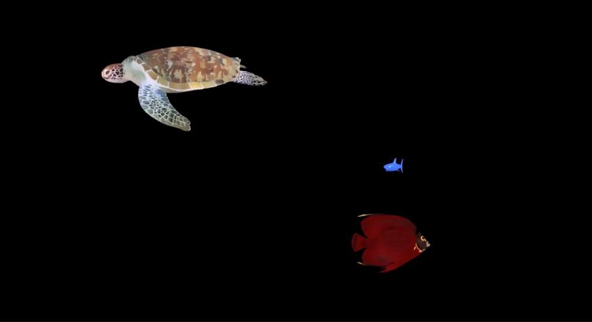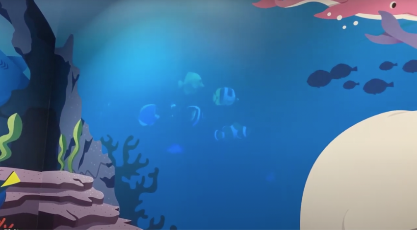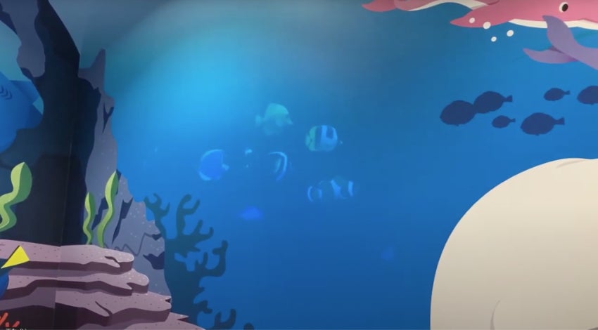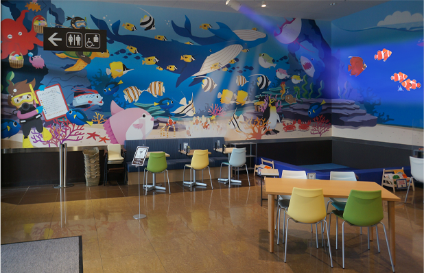 3Dモデルのフルアニメーションで制作することにより、「木更津の海」をモチーフにした、家族が一緒に楽しめるイートインスペース「Cafe&Dine/カフェアンドダイン」の壁面に描かれた海の中に、まるで実際の水族館にいるような臨場感のある映像表現を実現しています。
