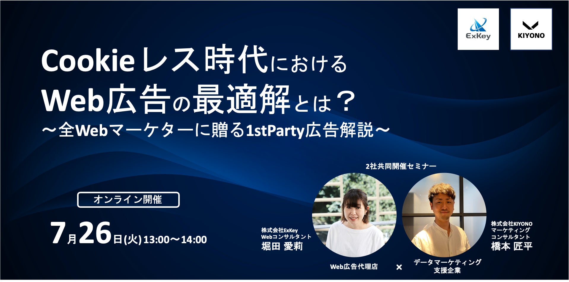 今回のセミナーでは、このWeb広告におけるCookieレス対策の最適解をご紹介させていただきます。Web広告の運用・コンサルティングのプロフェッショナルであるExKey社との共同開催で、「そもそもCookieとは何か?」「Cookie規制がもたらす影響とは?」「解決策である1stParty広告とは?」等、今Webマーケター様が求めているコンテンツについて丁寧に解説してまいります。