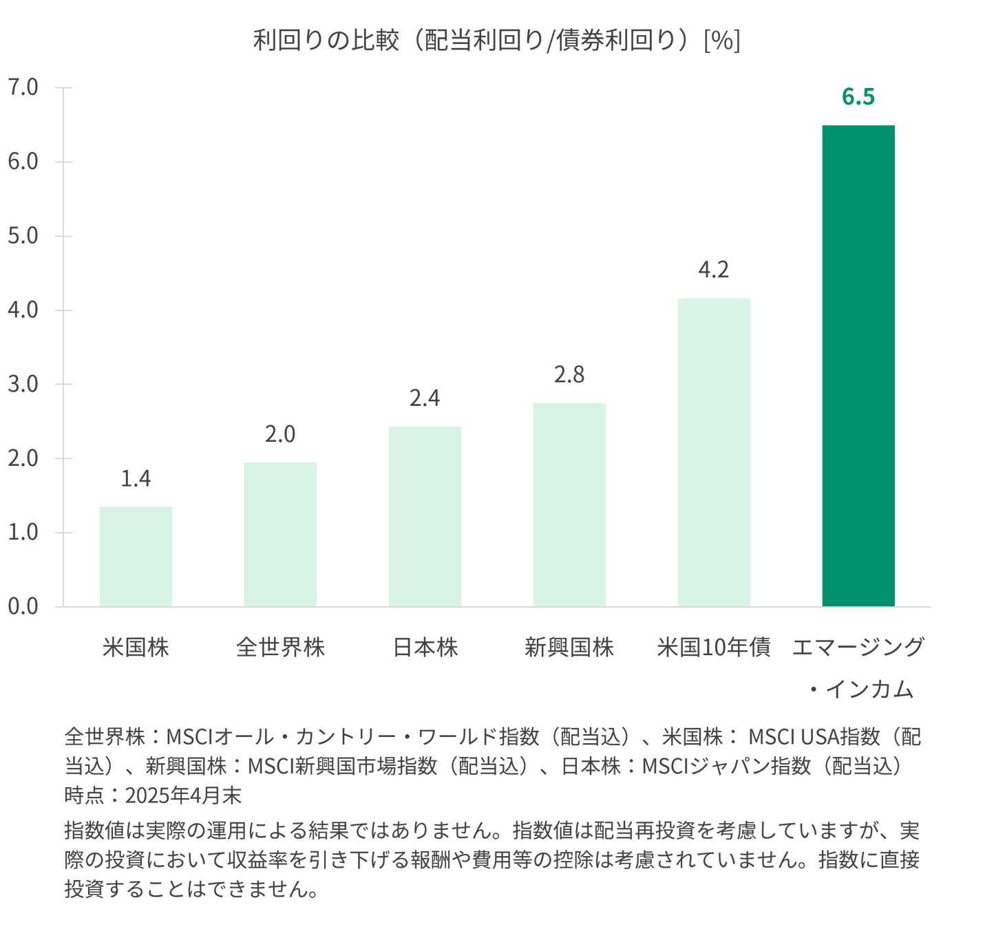 *2025年4月末時点、エマージング・インカムはエマージング・インカム指数の利回りを使用、他の該当ファンドは各々の投資対象資産の標準的な利回り水準を基に利回りを推定、sustenキャピタル・マネジメントの調査に基づく