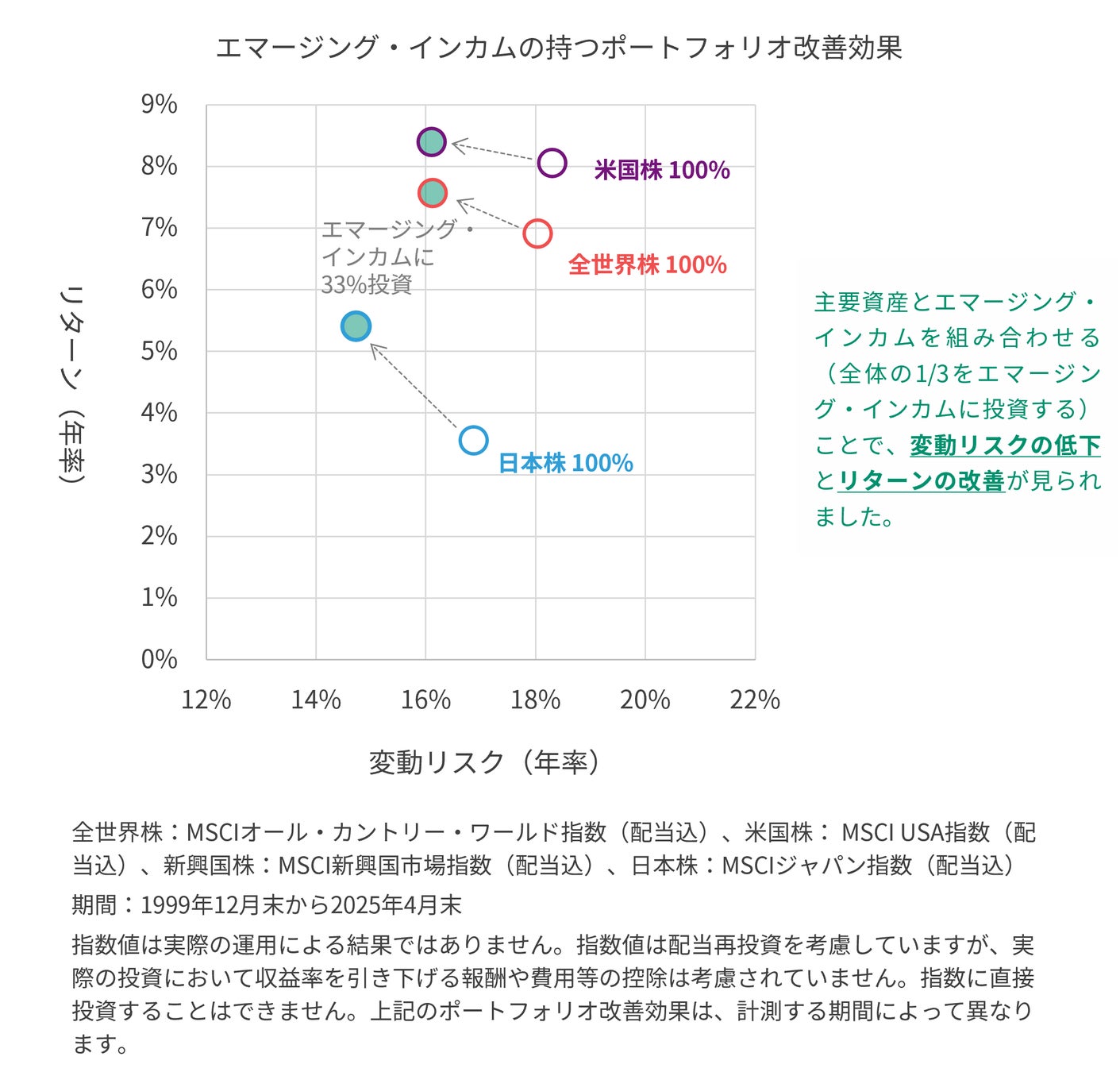 エマージング・インカム指数は新興国株式がもたらす成長性と、米ドル建て新興国債券の持つ相対的に高い利回りを組み合わせることで、一般的な株式投資よりも投資効率を高めつつリターンの獲得も目指せる特徴的な指数です。 米国株式や先進国株式に投資が集中しがちな投資家にとって、このファンドをポートフォリオに組み入れることで、地域分散とアセットクラス分散の双方の効果的な改善が期待できます。