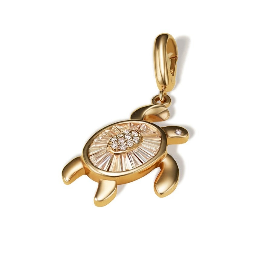 日本では長寿、富、知恵を象徴するラッキーチャームの亀。目と甲羅の内側部分にラウンドカットのダイヤモンド、甲羅の外側にバゲットカットのダイヤモンドが職人によって一つ一つセッティングされたモルディブタートルダイヤモンドチャーム。