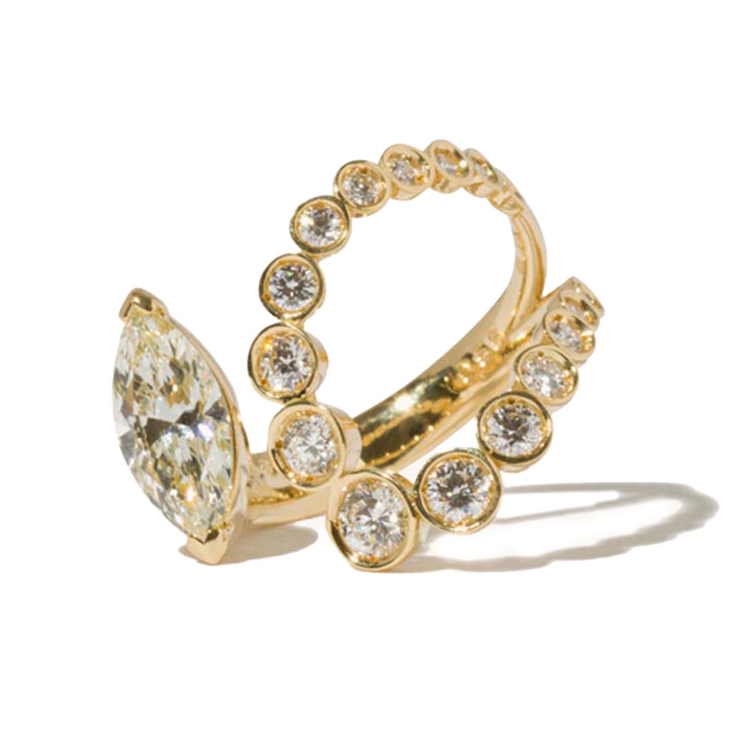 大粒のマーキスカットのダイヤモンドとラウンドカットのダイヤモンドがふんだんに施された非対称なデザインがミラモアらしいセルフダイヤモンドリング。