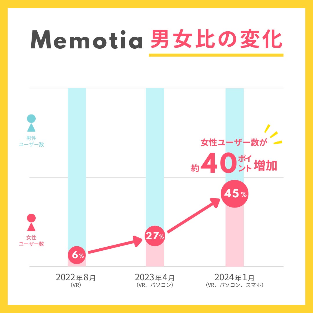 β版の時はVRヘッドセットのみに対応していましたが、サービス正式リリース時にはパソコンにも対応、2023年11月にはスマートフォンにも対応と、デバイスを増やすことで多くの女性にもご利用いただけるようになり、2024年2月現在、ユーザーの男女比は5:5となっています。