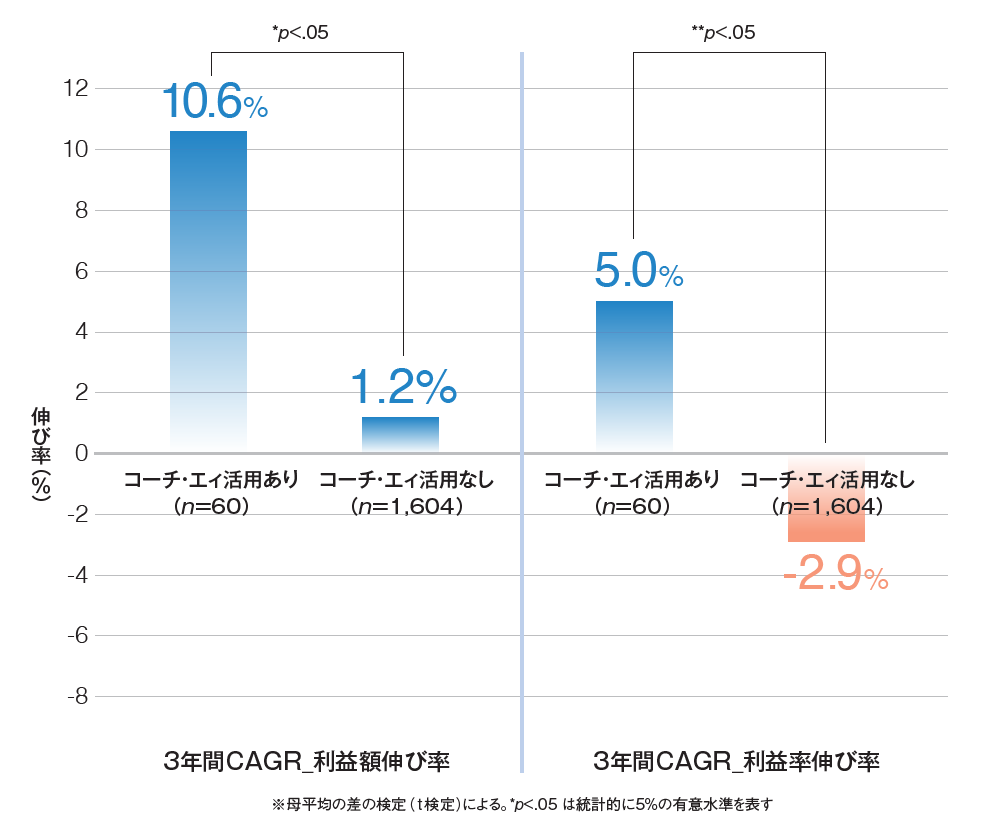 その結果、どちらの指標もコーチングを活用した企業群の方が統計的に有意に高い数字が示されました。具体的には、「3年間CAGR_利益額」では、コーチ・エィのコーチングを活用した企業群では10.6%の成長、それ以外の企業群では1.2%成長、「3年間CAGR_利益率」では、コーチ・エィのコーチングを活用した企業群はで5.0%の成長という結果です(図)。