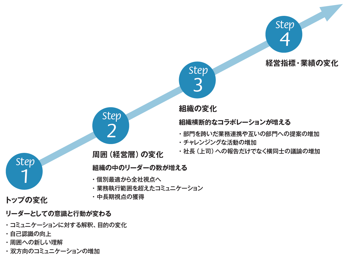 以下の図表は、今回のインタビューによる定性的な情報を仮説探索的に表現したものです。経営トップや経営陣がコーチング支援を受けることで、直接的・間接的な変化(効果)が周囲へ、さらには組織全体へと拡がり、最終的に経営成果につながっていると捉えることができます。