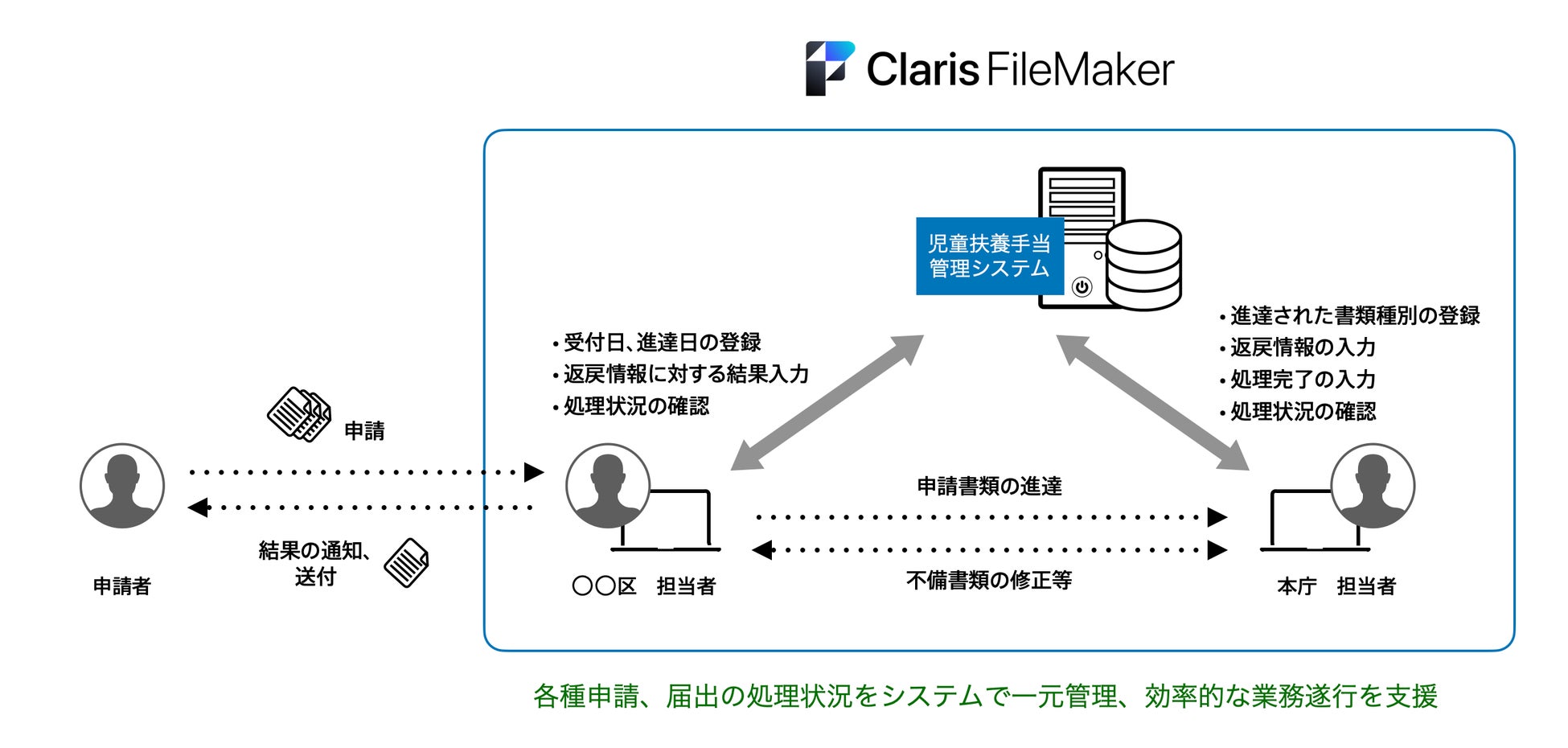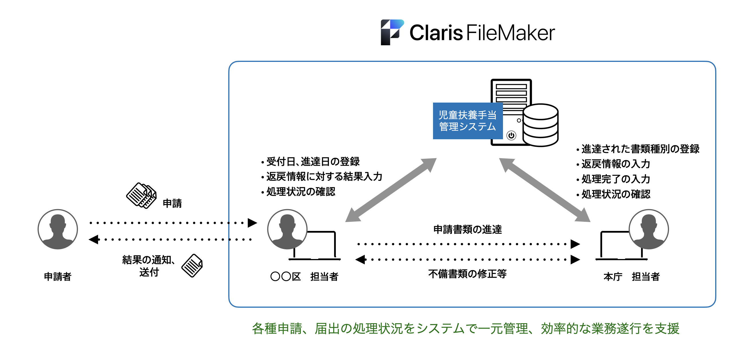紙や表計算ソフトによる受付簿を廃止し、新しく FileMaker で開発された児童扶養手当管理システムで進行管理を実施。庁内ネットワークにある FileMaker Server で一元的に管理することで区や本庁の担当者は常に最新の処理状況を共有し、スムーズで素早い業務遂行が可能となりました。