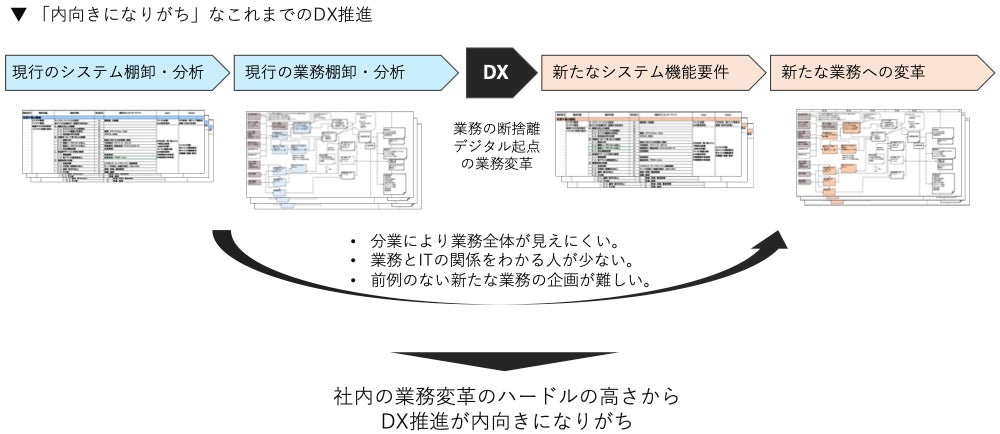 これまで多くの企業がDXプロジェクトを推進しておりますが、レガシーシステムの存在、膨大な機能や業務の棚卸しの必要性、属人化した業務の存在、前提のない新たな業務の企画の難しさといったボトルネックが浮き彫りになり、デジタルツールやSaaSの導入はできるものの、根本的なビジネスプロセスの変革にいたらないといった経営課題も顕在化してきました。事実、現行仕様の踏襲により、逆にシステム投資が肥大化させた事案も出てきております。