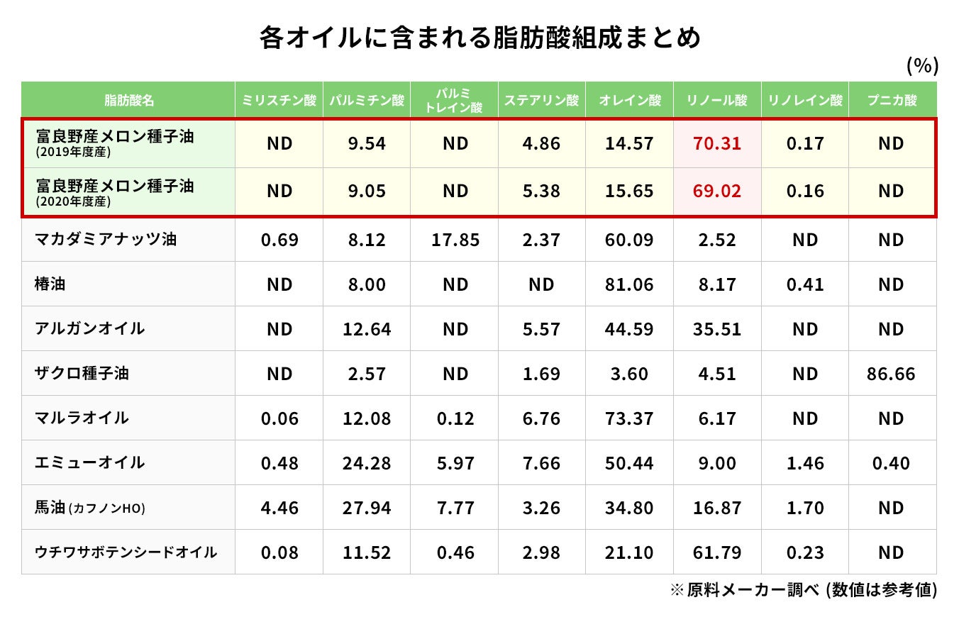 メロン種子油は、年齢による肌の変化にアプローチするリノール酸を70%含有。アルガン、ザクロ、マルラ、ウチワサボテン等のオイルを上回るリノール酸量(「各オイルに含まれる脂肪酸組成まとめ」参照)。リノール酸とは、体内で作ることができない不飽和脂肪酸の一種でスキンケアとして使用することで肌をやわらかく、ハリのある日々へ導きます。