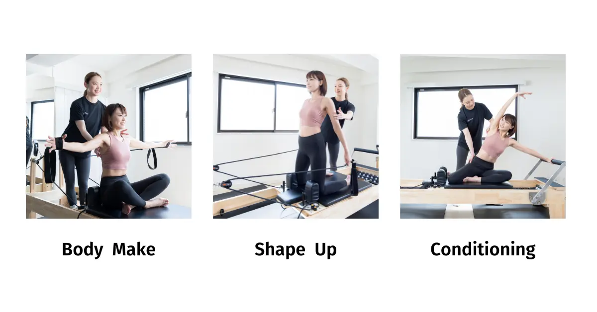 ELEMENTのマシンピラティスのトレーニングは30分の短時間集中型。自身が改善したいポイントや体調に合わせて3つのメニューから選ぶことが可能となっています。