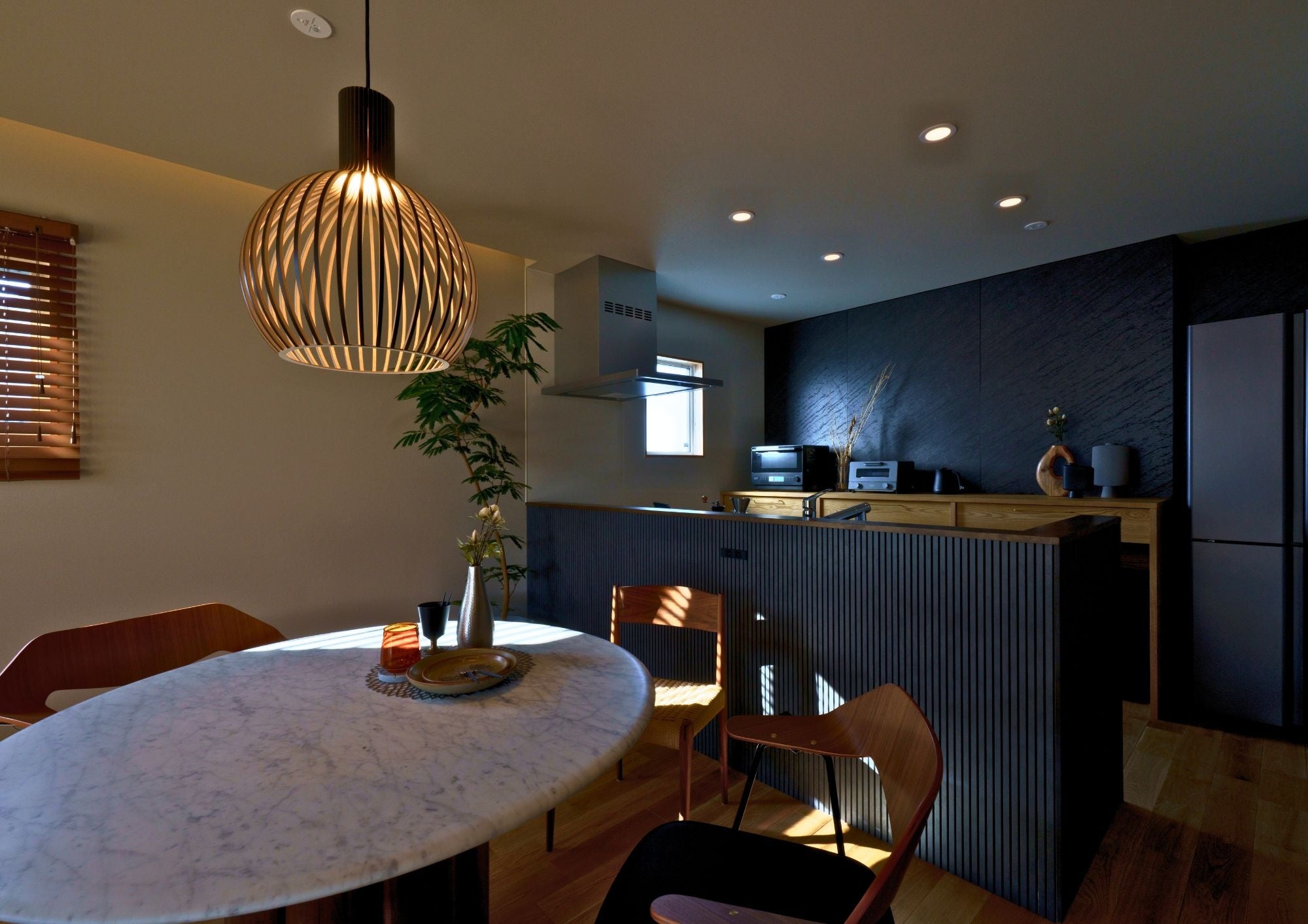 建物には、田部家の社有林の木や島根県産材を構造材として使用し、無垢材や塗り壁などの自然素材を随所に採用しました。五感にやさしく響く空間とし、動線計画や収納、光と風の取り入れ方まで丁寧に設計することで、日々の家事や暮らしの流れが自然と整う住まいとなっています。