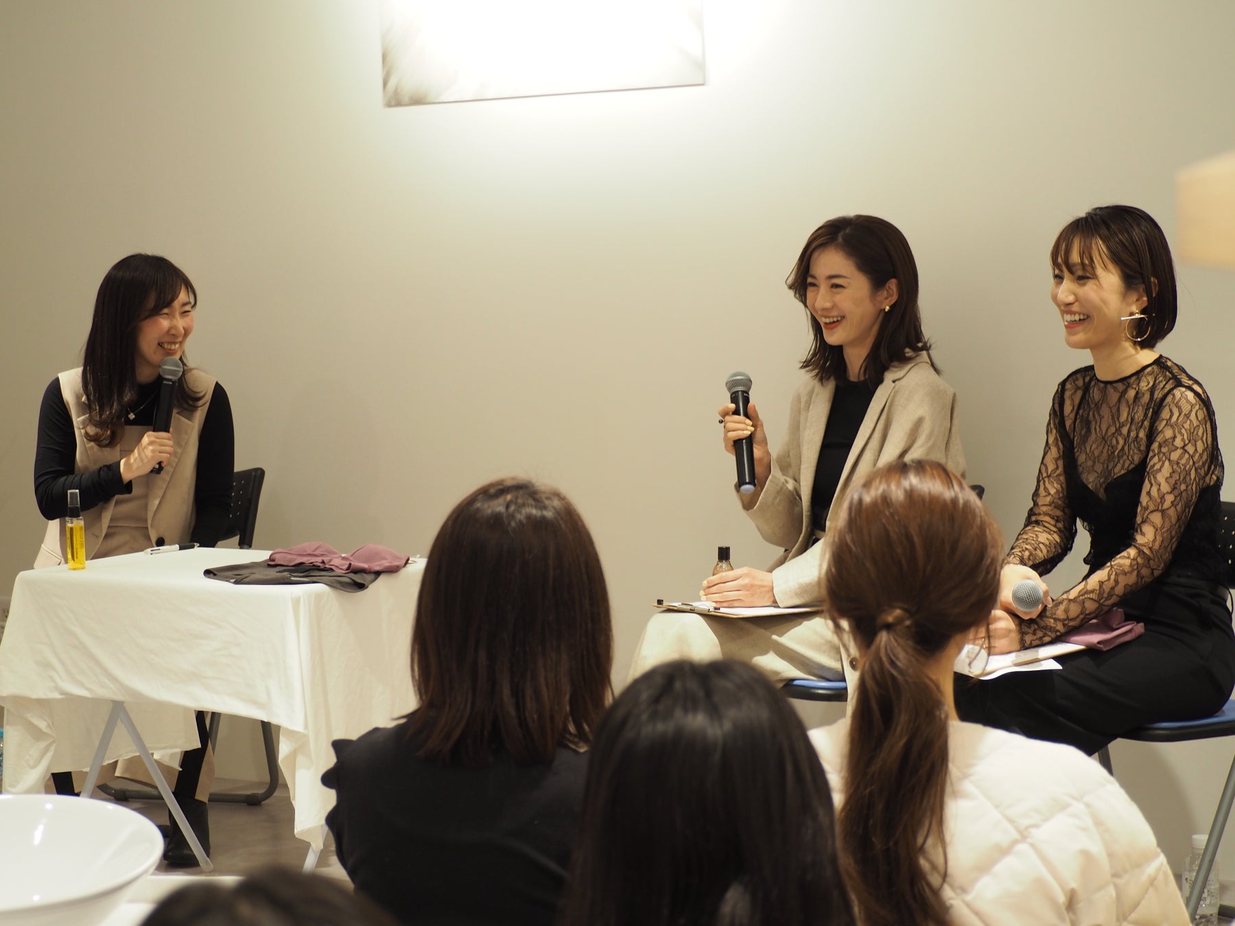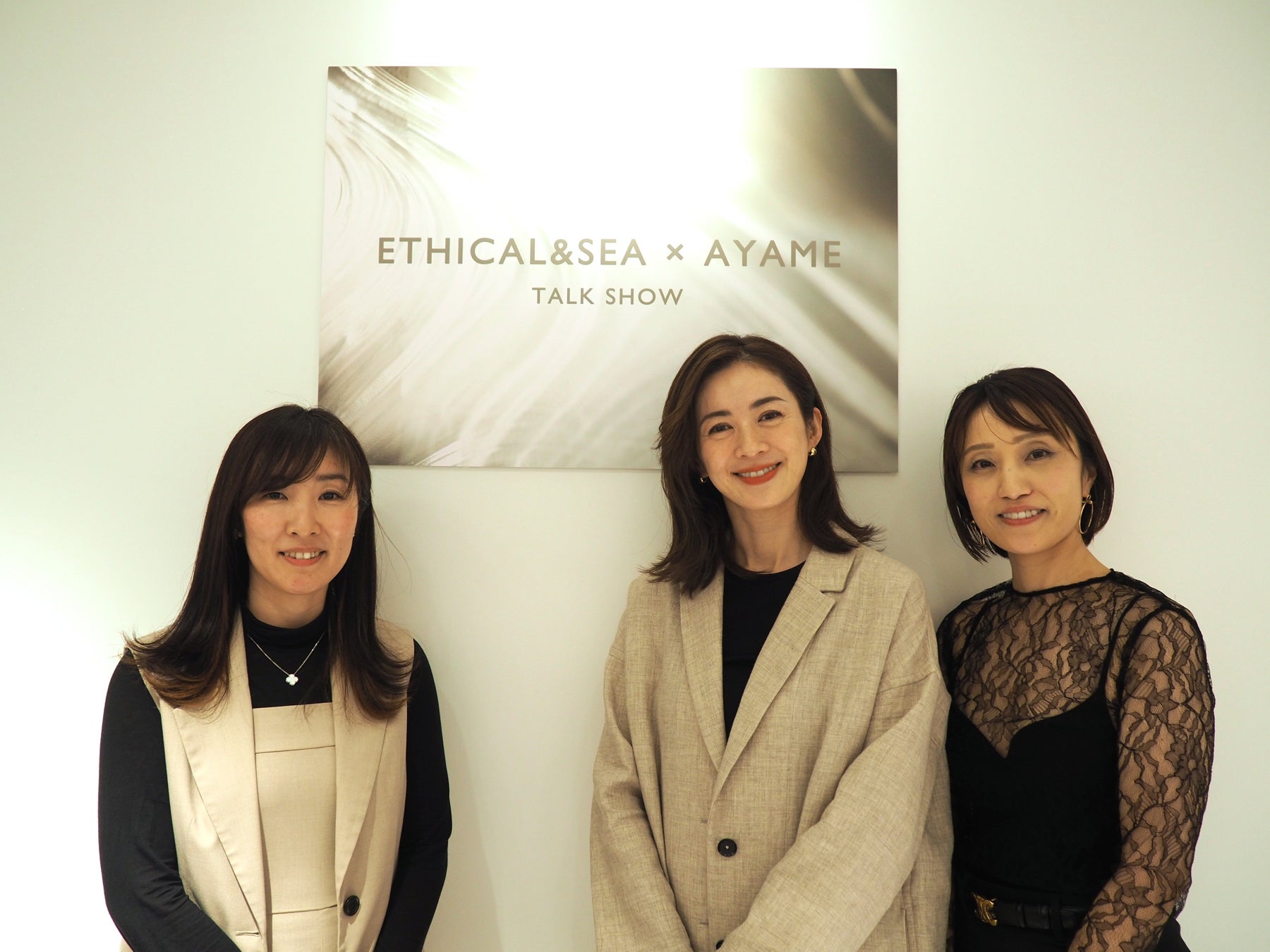 3月8日にayameブランドデビュー4周年と、Ethical&SEA二子玉川店2周年を迎えることをきっかけにアニバーサリーイベントを企画。同日の「国際女性デー」にちなんで【自分のカラダとの向き合い方】をテーマに、モデルの高垣麗子さん、Ethical&SEA二子玉川店オーナー 藤井桃子さん、ayameブランドプロデューサー 髙木麻衣の3名でトークショーを開催。「娘がいる40代の母」の共通点を持つ3名が女性のカラダの変化や普段の食生活、子育てに関するトークを繰り広げました。事前予約は開始と同時に満席になり、約30名にご来店いただきました。