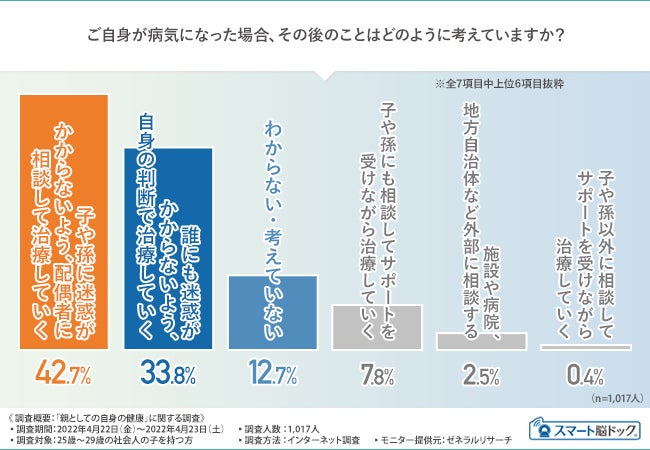 「ご自身が病気になった場合、その後のことはどのように考えていますか?」と質問したところ、『子や孫に迷惑がかからないよう、配偶者に相談して治療していく(42.7%)』が最多となり、以降『誰にも迷惑がかからないよう、自身の判断で治療していく(33.8%)』『わからない・考えていない(12.7%)』『子や孫にも相談してサポートを受けながら治療していく(7.8%)』『施設や病院、地方自治体など外部に相談する(2.5%)』『子や孫以外(自身の親・兄弟・姉妹など)に相談してサポートを受けながら治療していく(0.4%)』と続きました。〈図1〉