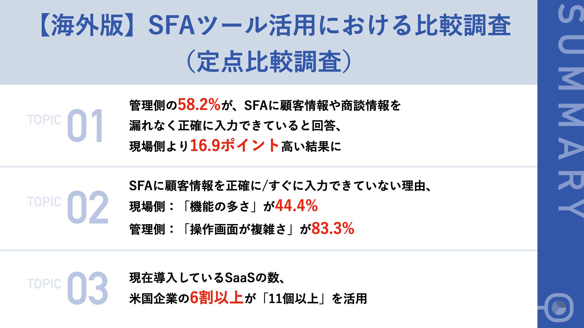 まず、SFAを導入している米国企業の部長・課長の58.2%、営業担当者の41.3%が、SFAに顧客情報や商談情報を「漏れなく正確に」入力できていると回答しました。SFA入力のタイミングについては、部長・課長の54.4%が、「商談後すぐに」入力できていると回答したのに対し、営業担当者は34.6%に留まっています。SAFに顧客情報を「漏れなく正確に」「商談後すぐに」入力できていない理由としては、部長・課長では「操作画面が複雑で分かりづらいから」(83.3%)、営業担当者では「余分な機能が多すぎて、使いにくいから」(44.4%)が最多となっています。また、部長・課長の46.8%、営業担当者の33.6%が、SFAで漏れなくネクストアクションの「管理ができている」と回答し、現場側は管理側より13.2ポイント低いことが分かりました。さらに、導入・利用しているSaaSツールの数について、日米企業で比較すると、米国企業の63.0%が「11個以上」と回答しているのに対し、日本企業は53.7%と下回る実態が明らかになりました。