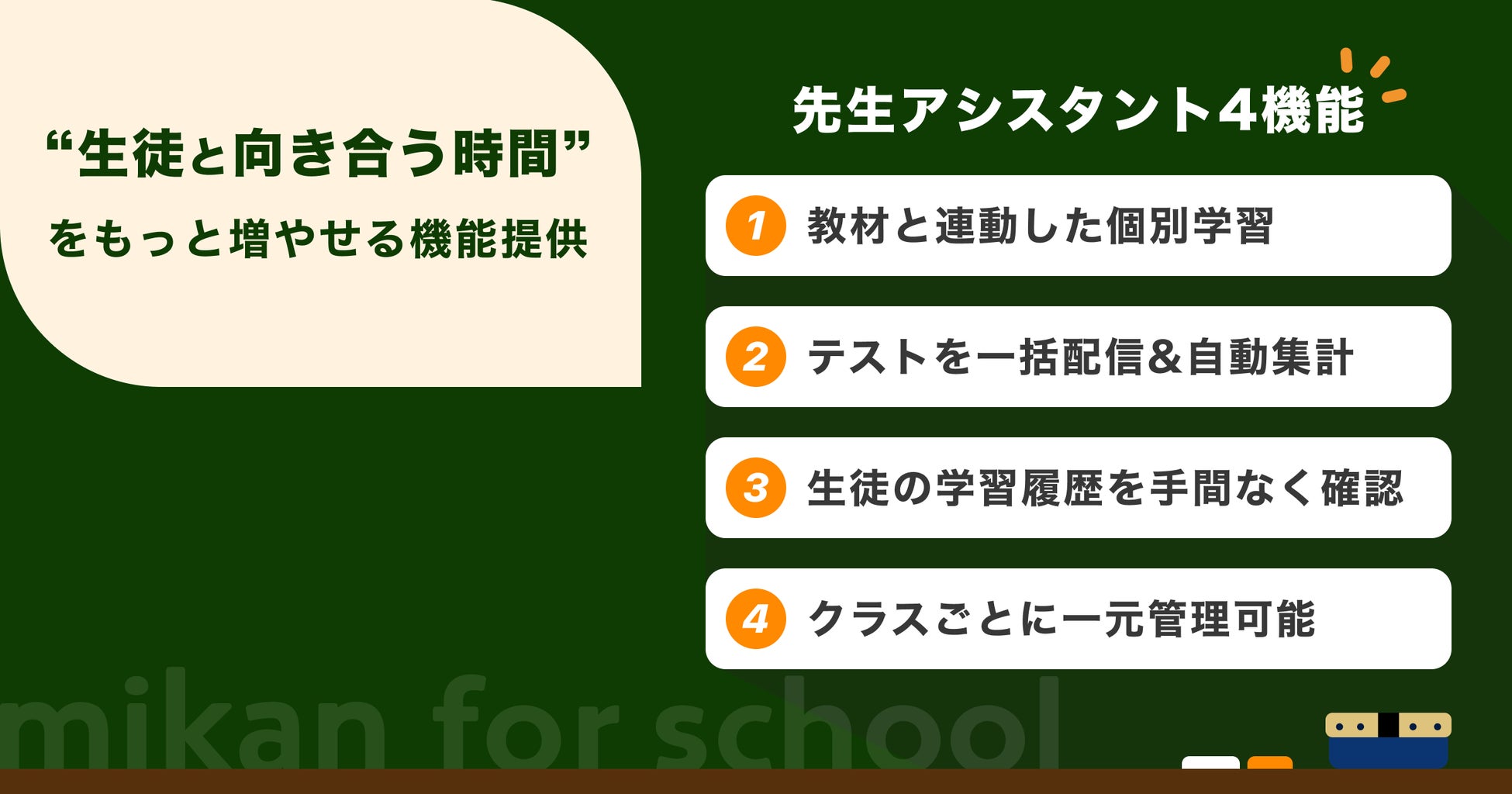 学校等教育現場向けの「mikan for school」は、先生には先生にしかできないことに時間を使っていただくことを目指した、先生の負担少なく生徒1人1人に個別最適化された英語学習機会を提供するサービスです。