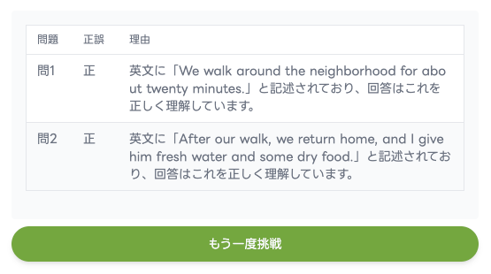 質問文は英語で提示されます。そして回答は日本語で行います。これにより、意味を理解しないまま英文に登場した単語をそのまま書くだけで答えになるようなズルを防ぎ、純粋に「内容を理解していたか」をチェックできます。